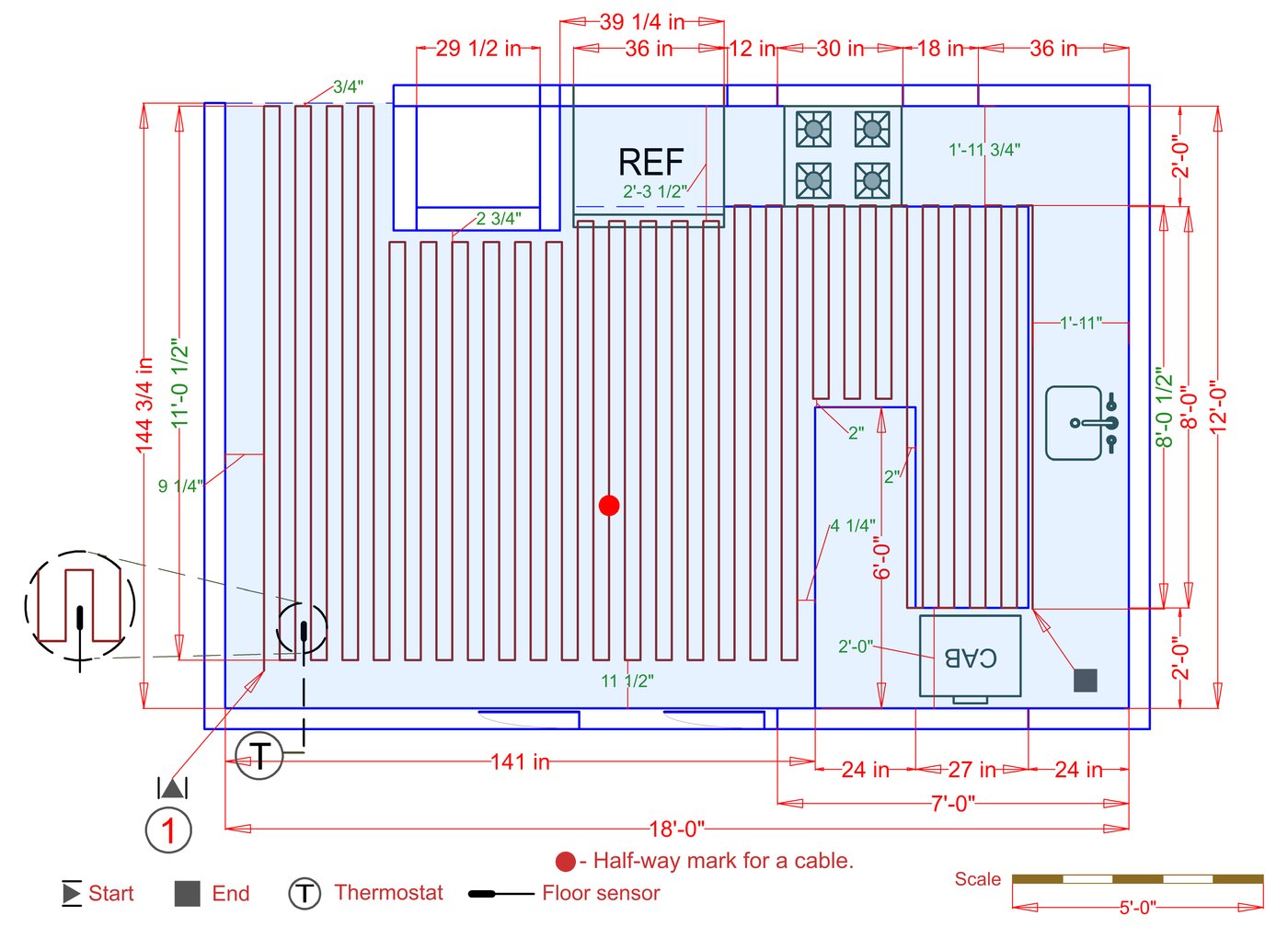 WarmlyYours offers a heating system for all of the most common flooring surfaces, including tile, stone, and marble. Each system type has unique advantages and best applications. Below you will find several different floor plans that are based on this example kitchen. Each breakdown is based on a different heating element and each breakdown will provide product information and costs. If you have any questions about which system type would be best for your project, you can contact us directly.Click on any of these available installation options below to see an example floor plan and project breakdown: