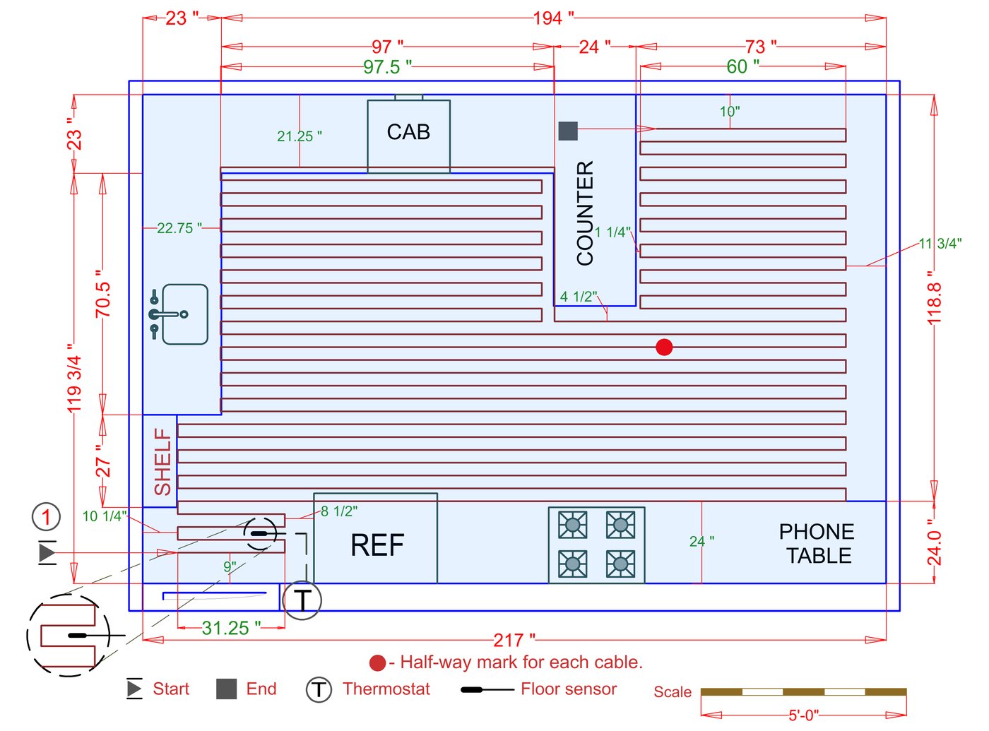 WarmlyYours offers a heating system for all of the most common flooring surfaces, including tile, stone, and marble. Each system type has unique advantages and best applications. Below you will find several different floor plans that are based on this example kitchen. Each breakdown is based on a different heating element and each breakdown will provide product information and costs. If you have any questions about which system type would be best for your project, you can contact us directly.Click on any of these available installation options below to see an example floor plan and project breakdown: