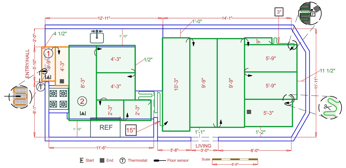 WarmlyYours offers a heating system for all of the most common flooring surfaces, including tile, stone, and marble. Each system type has unique advantages and best applications. Below you will find several different floor plans that are based on this example kitchen. Each breakdown is based on a different heating element and each breakdown will provide product information and costs. If you have any questions about which system type would be best for your project, you can contact us directly.Click on any of these available installation options below to see an example floor plan and project breakdown: