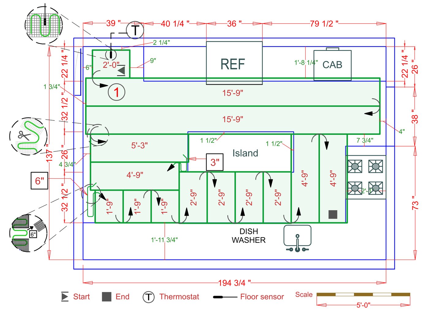 WarmlyYours offers a heating system for all of the most common flooring surfaces, including tile, stone, and marble. Each system type has unique advantages and best applications. Below you will find several different floor plans that are based on this example kitchen. Each breakdown is based on a different heating element and each breakdown will provide product information and costs. If you have any questions about which system type would be best for your project, you can contact us directly.Click on any of these available installation options below to see an example floor plan and project breakdown:
