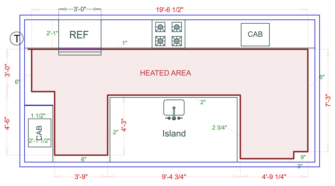 WarmlyYours offers a heating system for all of the most common flooring surfaces, including tile, stone, and marble. Each system type has unique advantages and best applications. Below you will find several different floor plans that are based on this example kitchen. Each breakdown is based on a different heating element and each breakdown will provide product information and costs. If you have any questions about which system type would be best for your project, you can contact us directly.