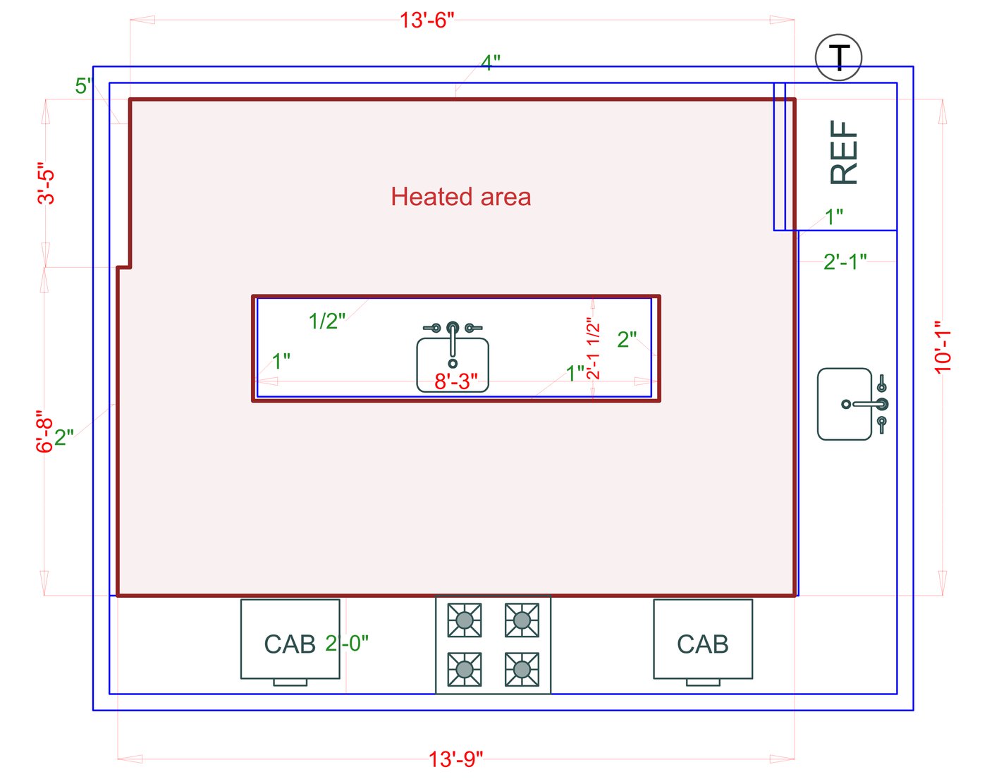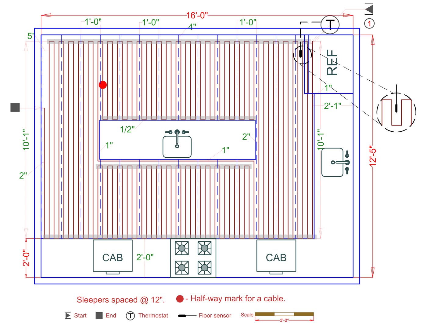 WarmlyYours offers a heating system for all of the most common flooring surfaces, including tile, stone, and marble. Each system type has unique advantages and best applications. Below you will find several different floor plans that are based on this example kitchen. Each breakdown is based on a different heating element and each breakdown will provide product information and costs. If you have any questions about which system type would be best for your project, you can contact us directly.