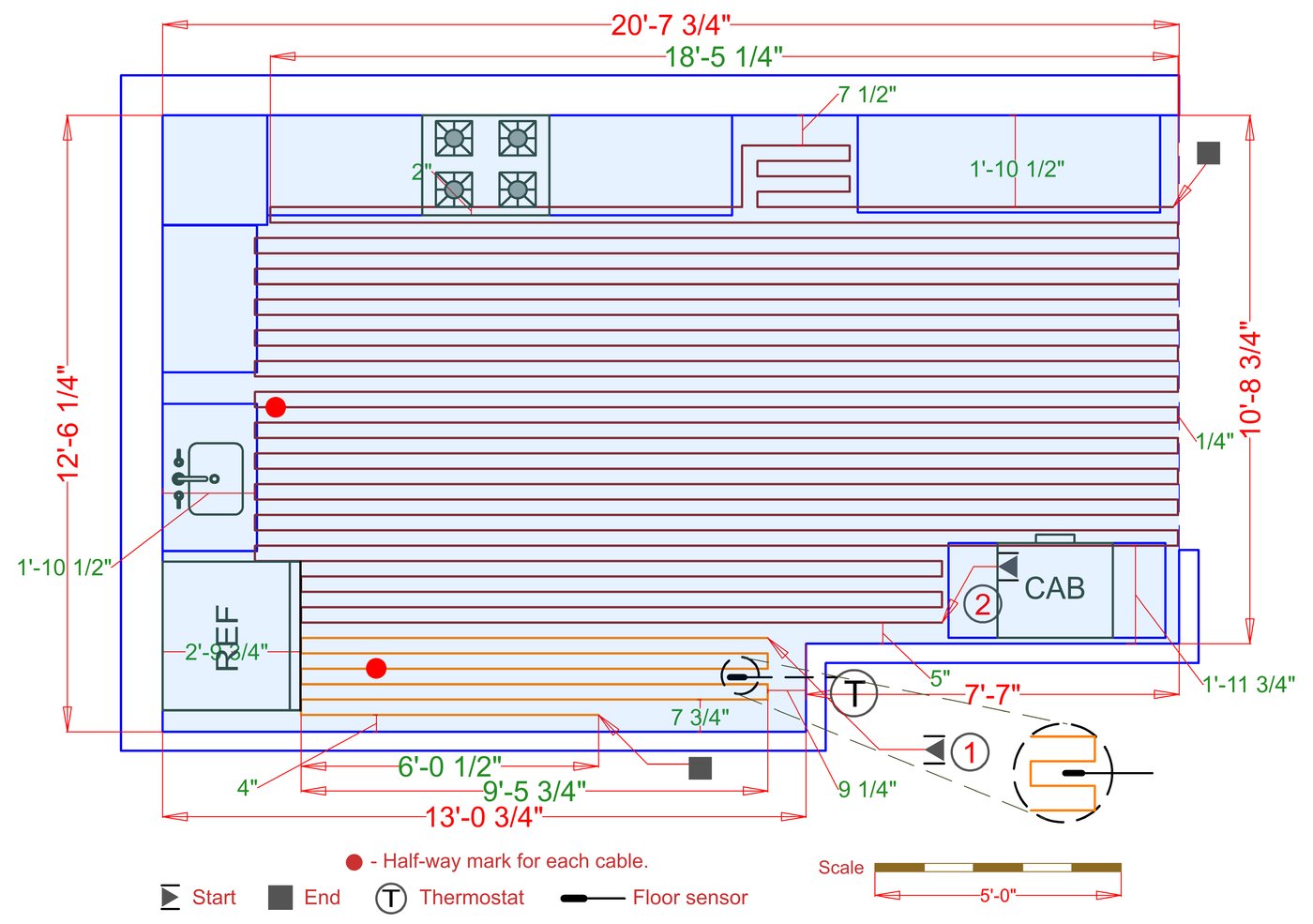 WarmlyYours offers a heating system for all of the most common flooring surfaces, including tile, stone, and marble. Each system type has unique advantages and best applications. Below you will find several different floor plans that are based on this example kitchen. Each breakdown is based on a different heating element and each breakdown will provide product information and costs. If you have any questions about which system type would be best for your project, you can contact us directly.Click on any of these available installation options below to see an example floor plan and project breakdown: