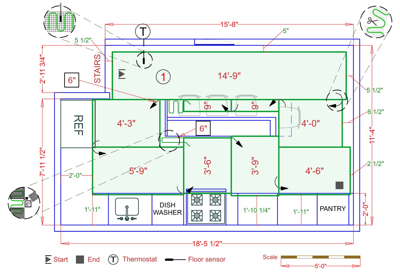 WarmlyYours offers a heating system for all of the most common flooring surfaces, including tile, stone, and marble. Each system type has unique advantages and best applications. Below you will find several different floor plans that are based on this example kitchen. Each breakdown is based on a different heating element and each breakdown will provide product information and costs. If you have any questions about which system type would be best for your project, you can contact us directly.Click on any of these available installation options below to see an example floor plan and project breakdown: