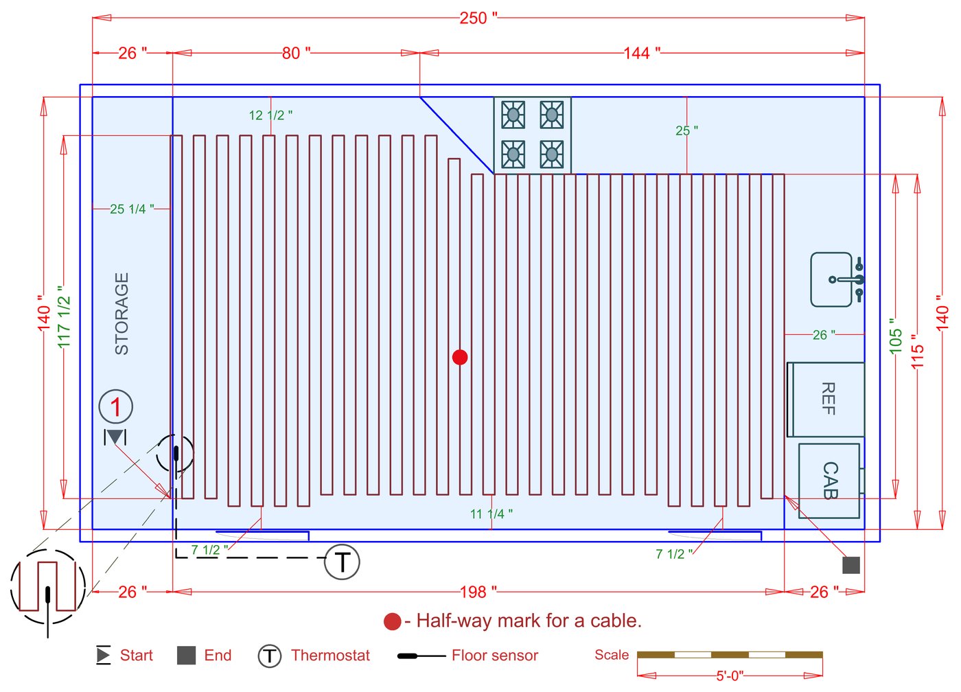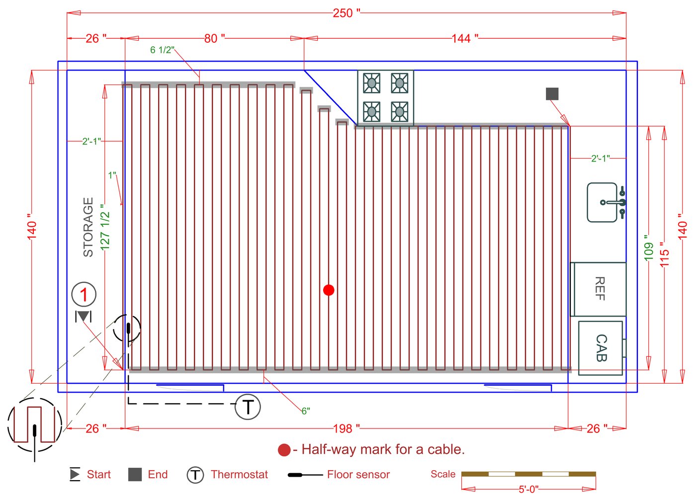 WarmlyYours offers a heating system for all of the most common flooring surfaces, including tile, stone, and marble. Each system type has unique advantages and best applications. Below you will find several different floor plans that are based on this example kitchen. Each breakdown is based on a different heating element and each breakdown will provide product information and costs. If you have any questions about which system type would be best for your project, you can contact us directly.Click on any of these available installation options below to see an example floor plan and project breakdown: