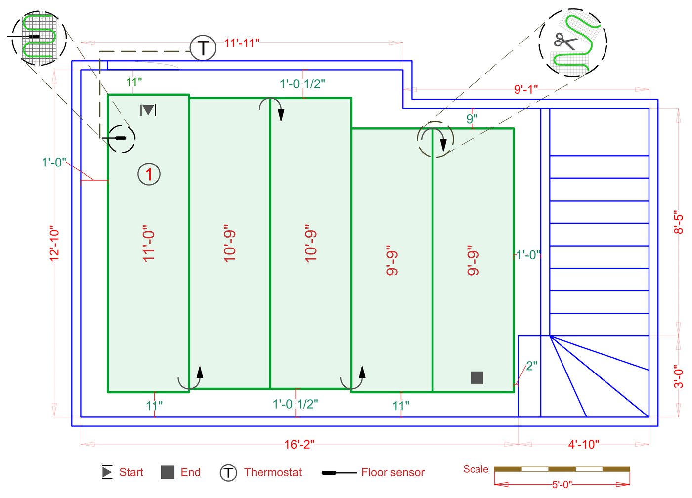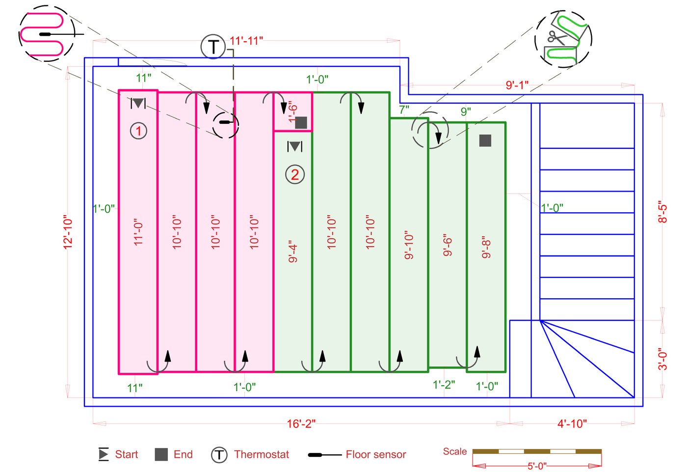 WarmlyYours offers a heating system for all of the most common flooring surfaces, including tile, stone, and marble. Each system type has unique advantages and best applications. Below you will find several different floor plans that are based on this example basement. Each breakdown is based on a different heating element and each breakdown will provide product information and costs. If you have any questions about which system type would be best for your project, you can contact us directly.