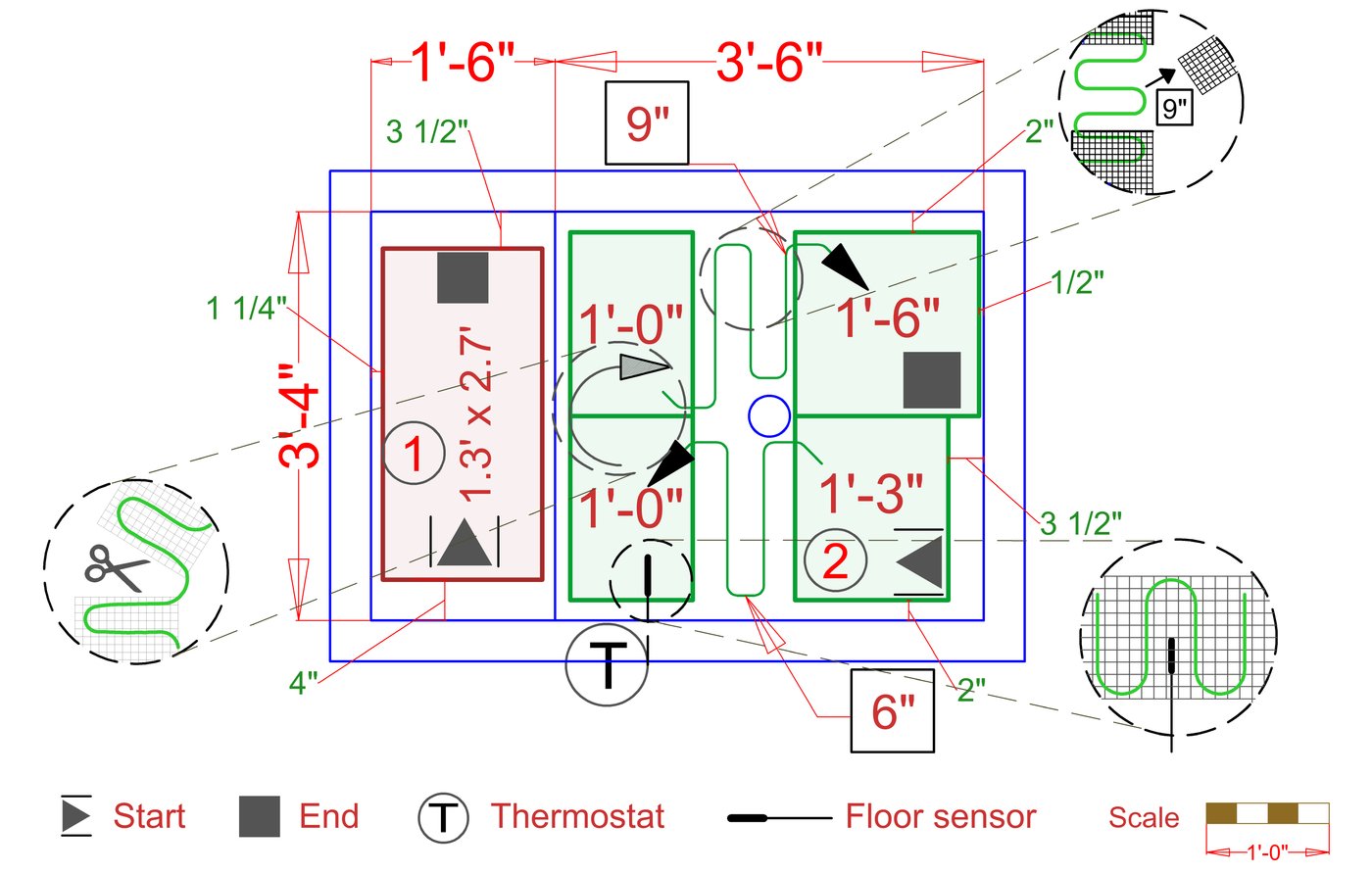 WarmlyYours offers a heating system for all of the most common flooring surfaces, including tile, stone, and marble. Each system type has unique advantages and best applications. Below you will find several different floor plans that are based on this example shower. Each breakdown is based on a different heating element and each breakdown will provide product information and costs. If you have any questions about which system type would be best for your project, you can contact us directly.