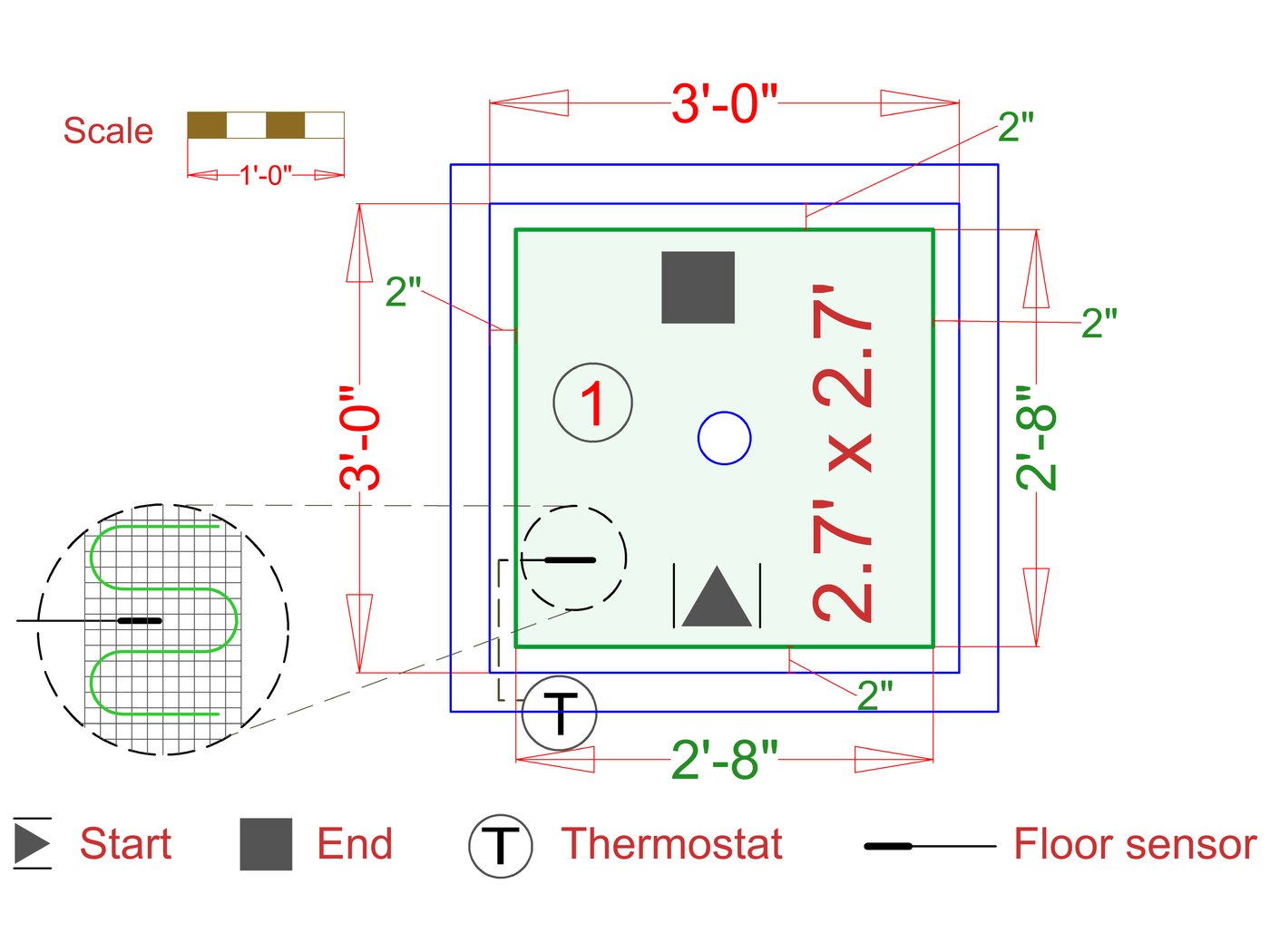WarmlyYours offers a heating system for all of the most common flooring surfaces, including tile, stone, and marble. Each system type has unique advantages and best applications. Below you will find several different floor plans that are based on this example shower. Each breakdown is based on a different heating element and each breakdown will provide product information and costs. If you have any questions about which system type would be best for your project, you can contact us directly.