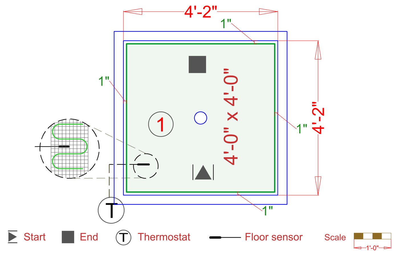 WarmlyYours offers a heating system for all of the most common flooring surfaces, including tile, stone, and marble. Each system type has unique advantages and best applications. Below you will find several different floor plans that are based on this example shower. Each breakdown is based on a different heating element and each breakdown will provide product information and costs. If you have any questions about which system type would be best for your project, you can contact us directly.