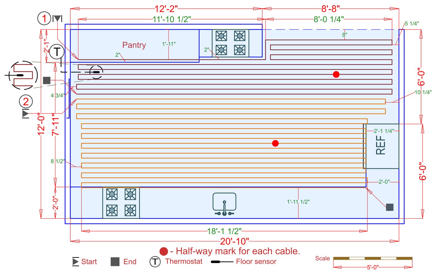 WarmlyYours offers a heating system for all of the most common flooring surfaces, including tile, stone, and marble. Each system type has unique advantages and best applications. Below you will find several different floor plans that are based on this example kitchen. Each breakdown is based on a different heating element and each breakdown will provide product information and costs. If you have any questions about which system type would be best for your project, you can contact us directly.Click on any of these available installation options below to see an example floor plan and project breakdown: