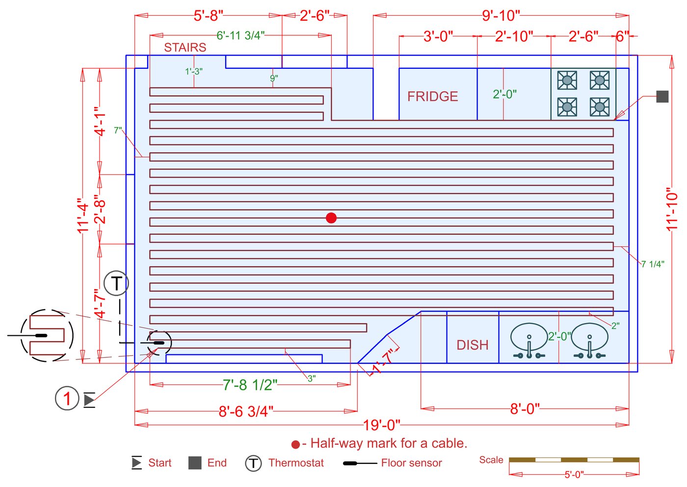 WarmlyYours offers a heating system for all of the most common flooring surfaces, including tile, stone, and marble. Each system type has unique advantages and best applications. Below you will find several different floor plans that are based on this example kitchen. Each breakdown is based on a different heating element and each breakdown will provide product information and costs. If you have any questions about which system type would be best for your project, you can contact us directly.Click on any of these available installation options below to see an example floor plan and project breakdown: