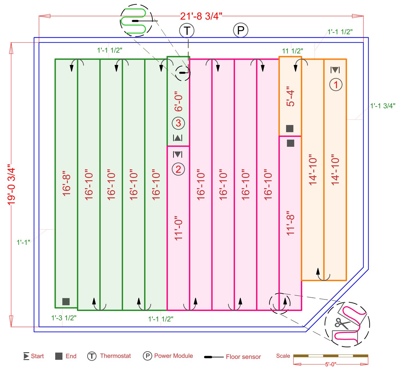 WarmlyYours offers a heating system for all of the most common flooring surfaces, including tile, stone, and marble. Each system type has unique advantages and best applications. Below you will find several different floor plans that are based on this example sunroom. Each breakdown is based on a different heating element and each breakdown will provide product information and costs. If you have any questions about which system type would be best for your project, you can contact us directly.