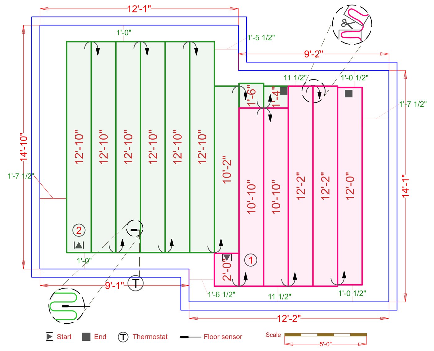 WarmlyYours offers a heating system for all of the most common flooring surfaces, including tile, stone, and marble. Each system type has unique advantages and best applications. Below you will find several different floor plans that are based on this example sunroom. Each breakdown is based on a different heating element and each breakdown will provide product information and costs. If you have any questions about which system type would be best for your project, you can contact us directly.