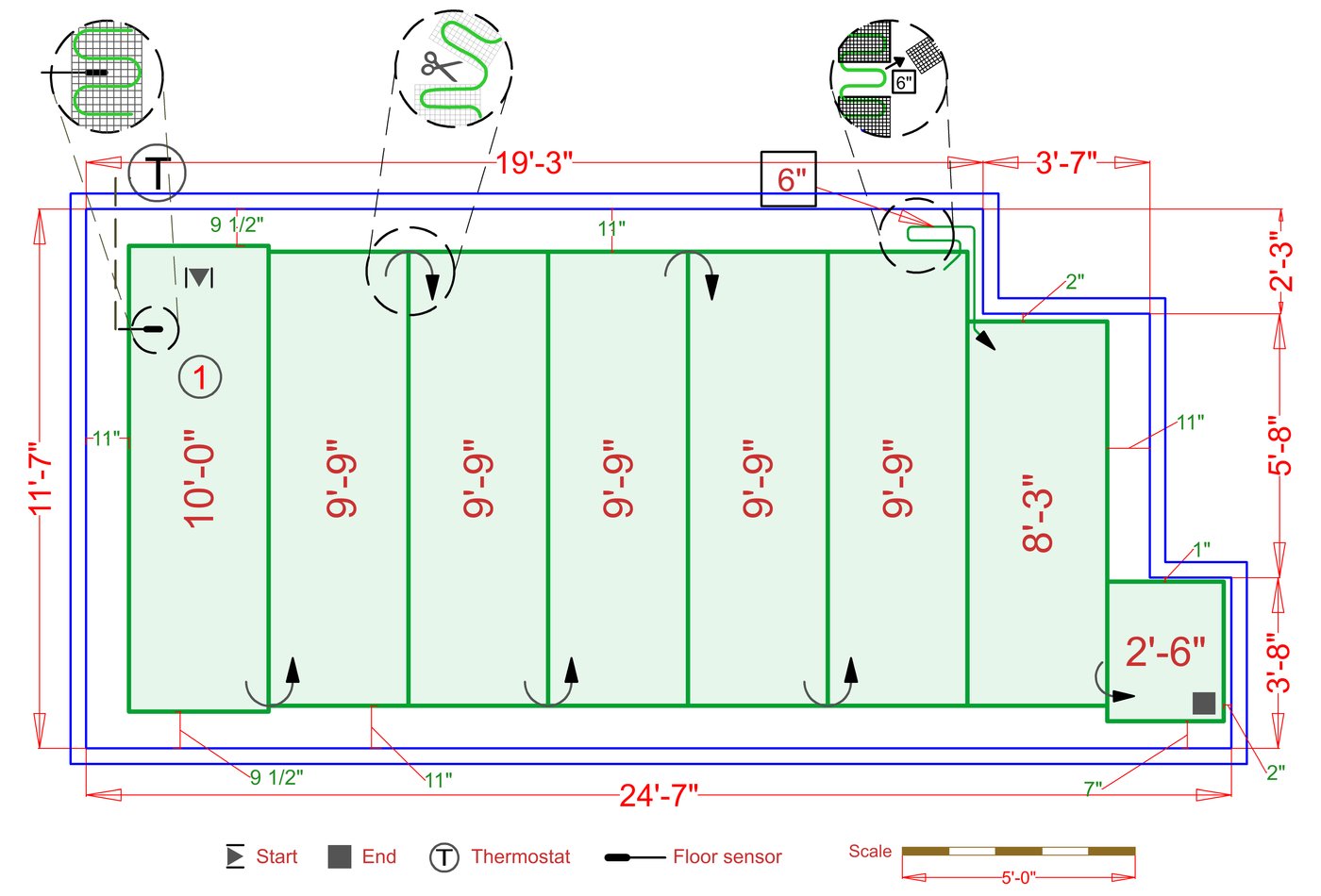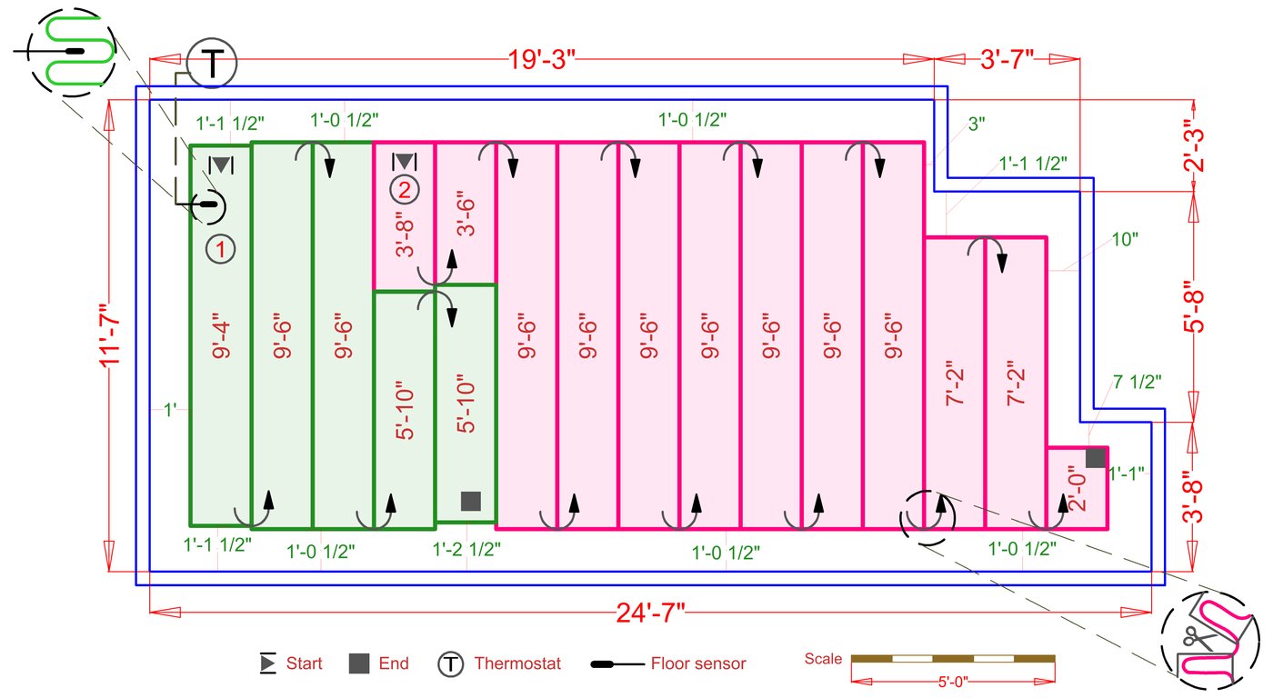 TempZone™ heated rolls consist of a heating cable secured onto a green mesh fabric with the heating cable distributed in serpentine loops. The cable loops are 3" apart, which helps deliver even heating throughout flooring areas, never leaving cold spots in the room.