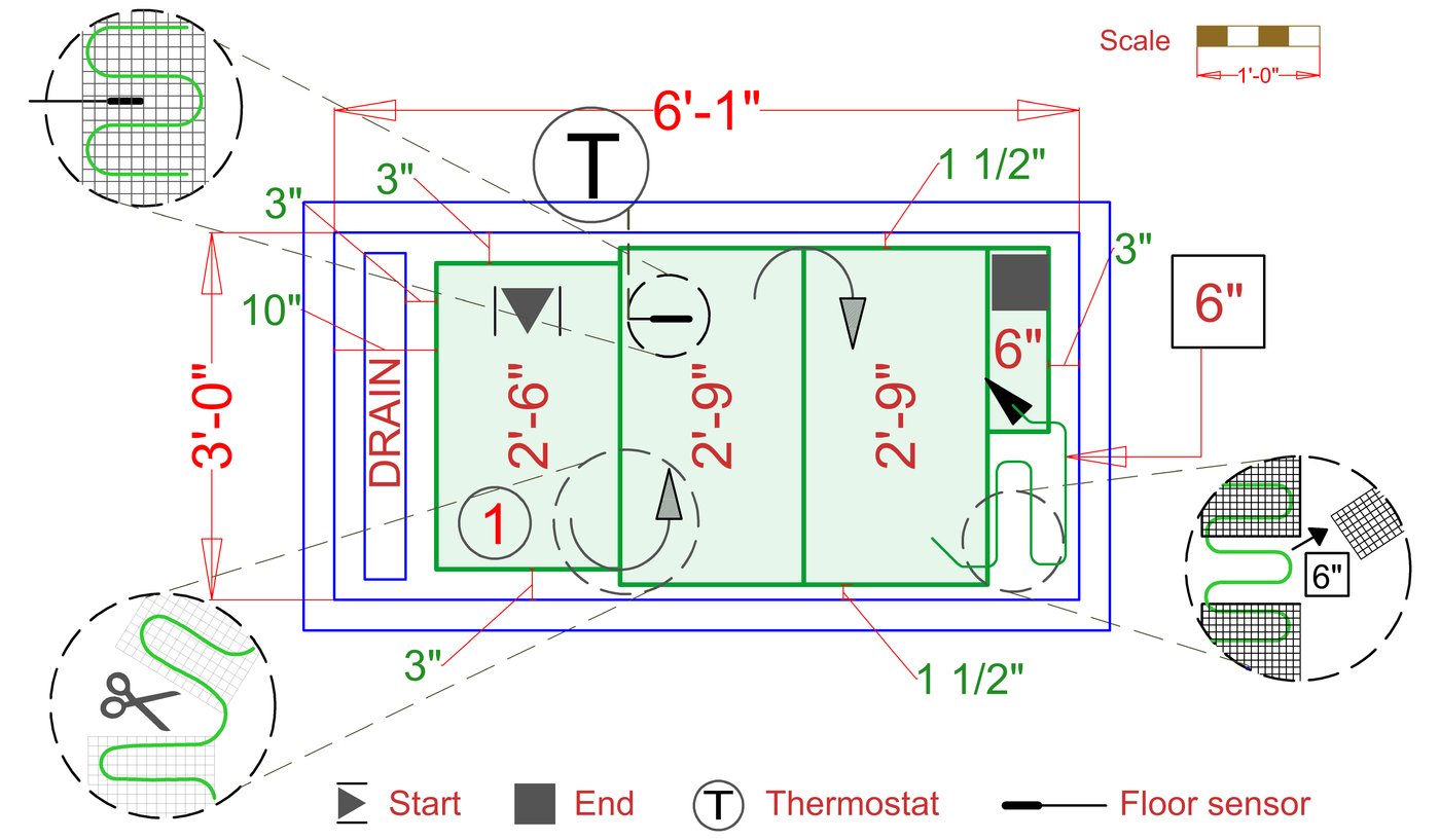 WarmlyYours offers a heating system for all of the most common flooring surfaces, including tile, stone, and marble. Each system type has unique advantages and best applications. Below you will find several different floor plans that are based on this example shower. Each breakdown is based on a different heating element and each breakdown will provide product information and costs. If you have any questions about which system type would be best for your project, you can contact us directly.