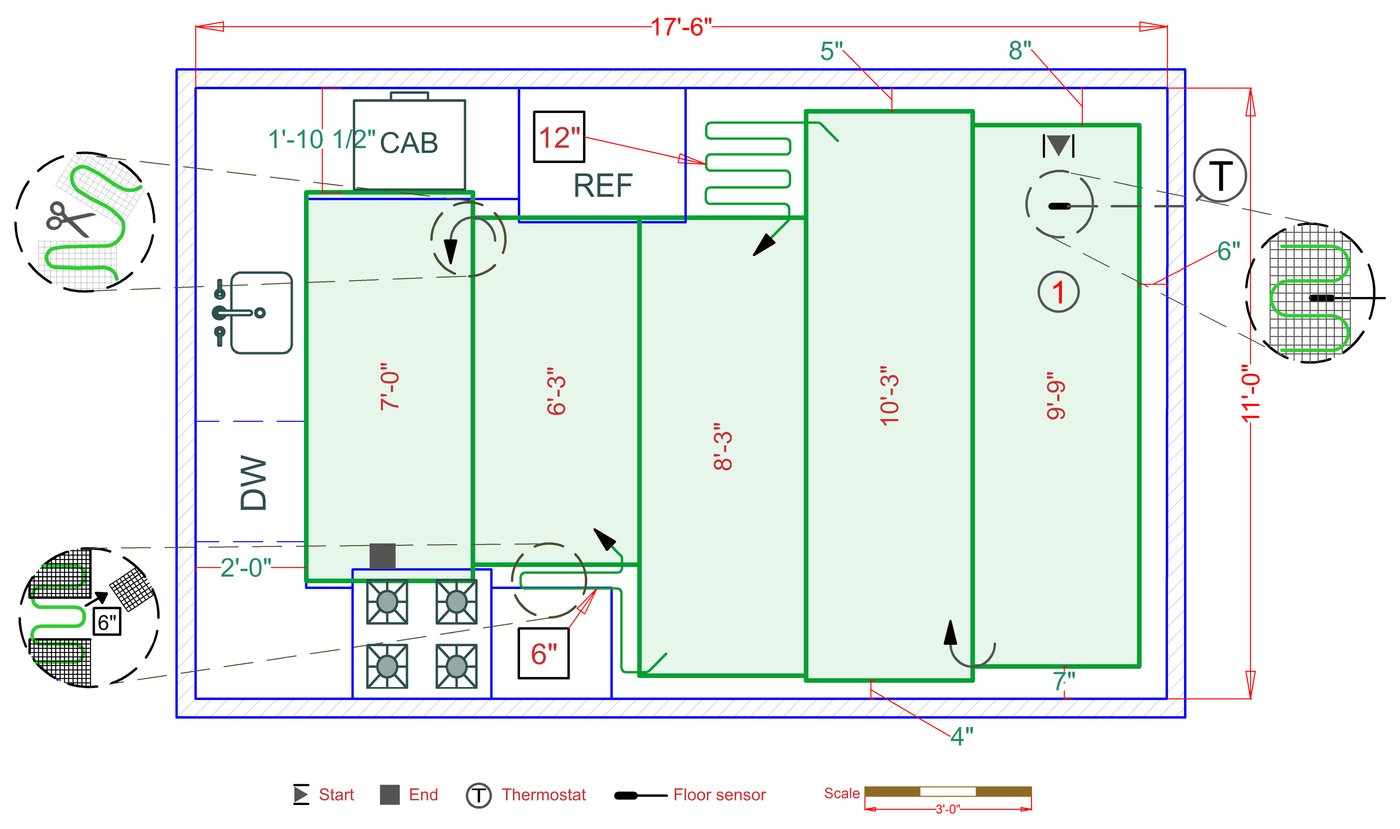 WarmlyYours offers a heating system for all of the most common flooring surfaces, including tile, stone, and marble. Each system type has unique advantages and best applications. Below you will find several different floor plans that are based on this example kitchen. Each breakdown is based on a different heating element and each breakdown will provide product information and costs. If you have any questions about which system type would be best for your project, you can contact us directly.