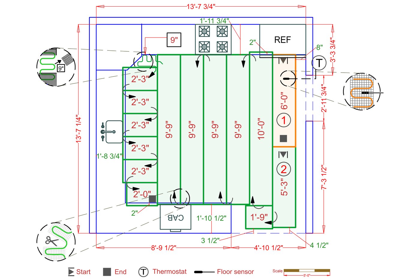 WarmlyYours offers a heating system for all of the most common flooring surfaces, including tile, stone, and marble. Each system type has unique advantages and best applications. Below you will find several different floor plans that are based on this example kitchen. Each breakdown is based on a different heating element and each breakdown will provide product information and costs. If you have any questions about which system type would be best for your project, you can contact us directly.Click on any of these available installation options below to see an example floor plan and project breakdown: