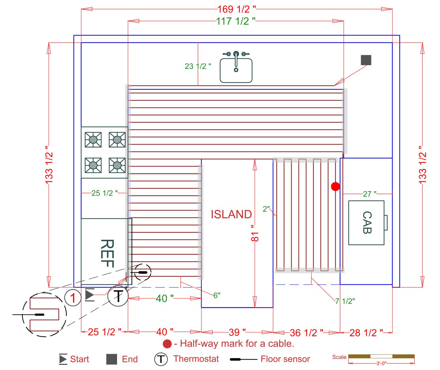 WarmlyYours offers a heating system for all of the most common flooring surfaces, including tile, stone, and marble. Each system type has unique advantages and best applications. Below you will find several different floor plans that are based on this example kitchen. Each breakdown is based on a different heating element and each breakdown will provide product information and costs. If you have any questions about which system type would be best for your project, you can contact us directly.Click on any of these available installation options below to see an example floor plan and project breakdown:
