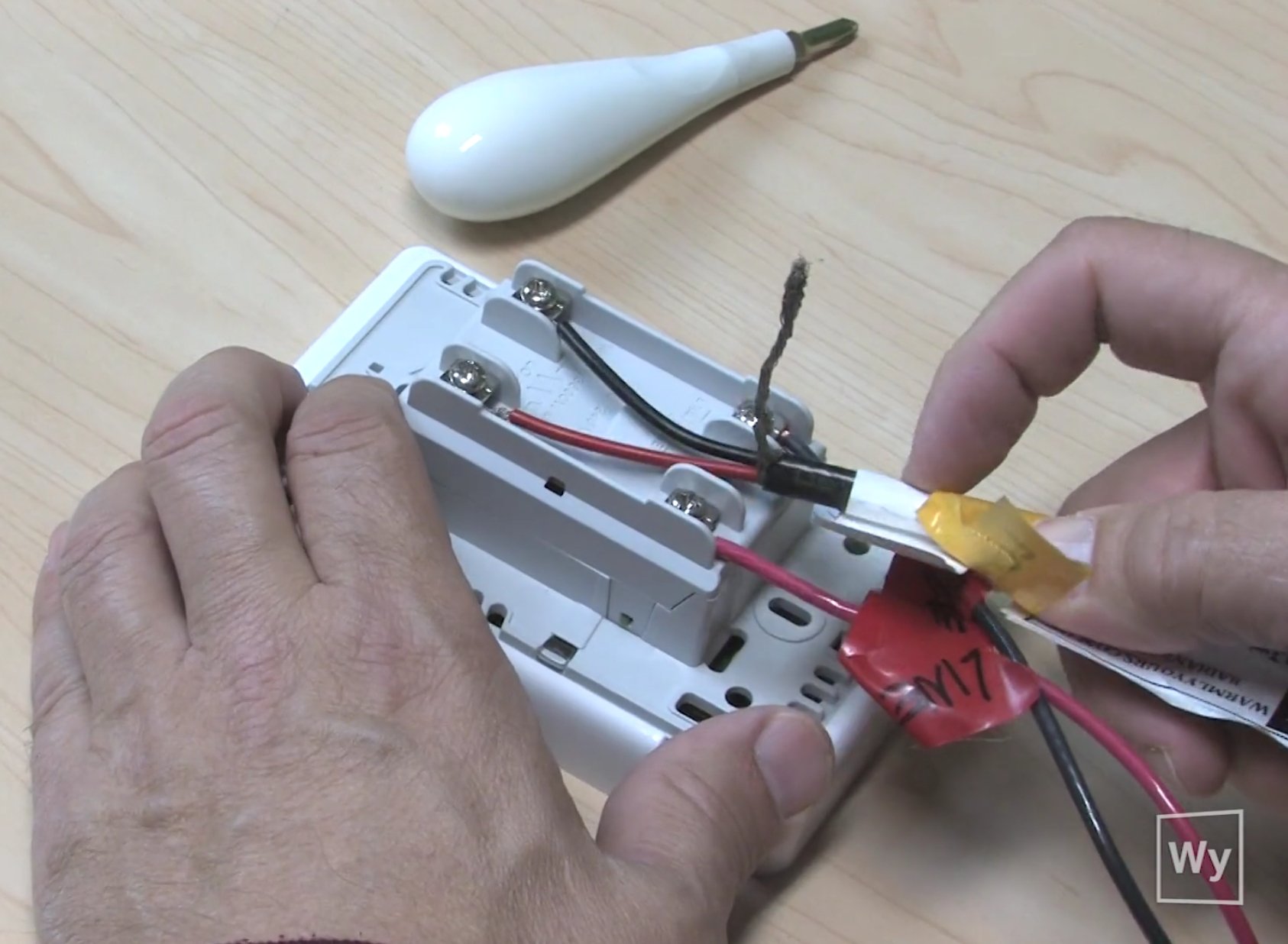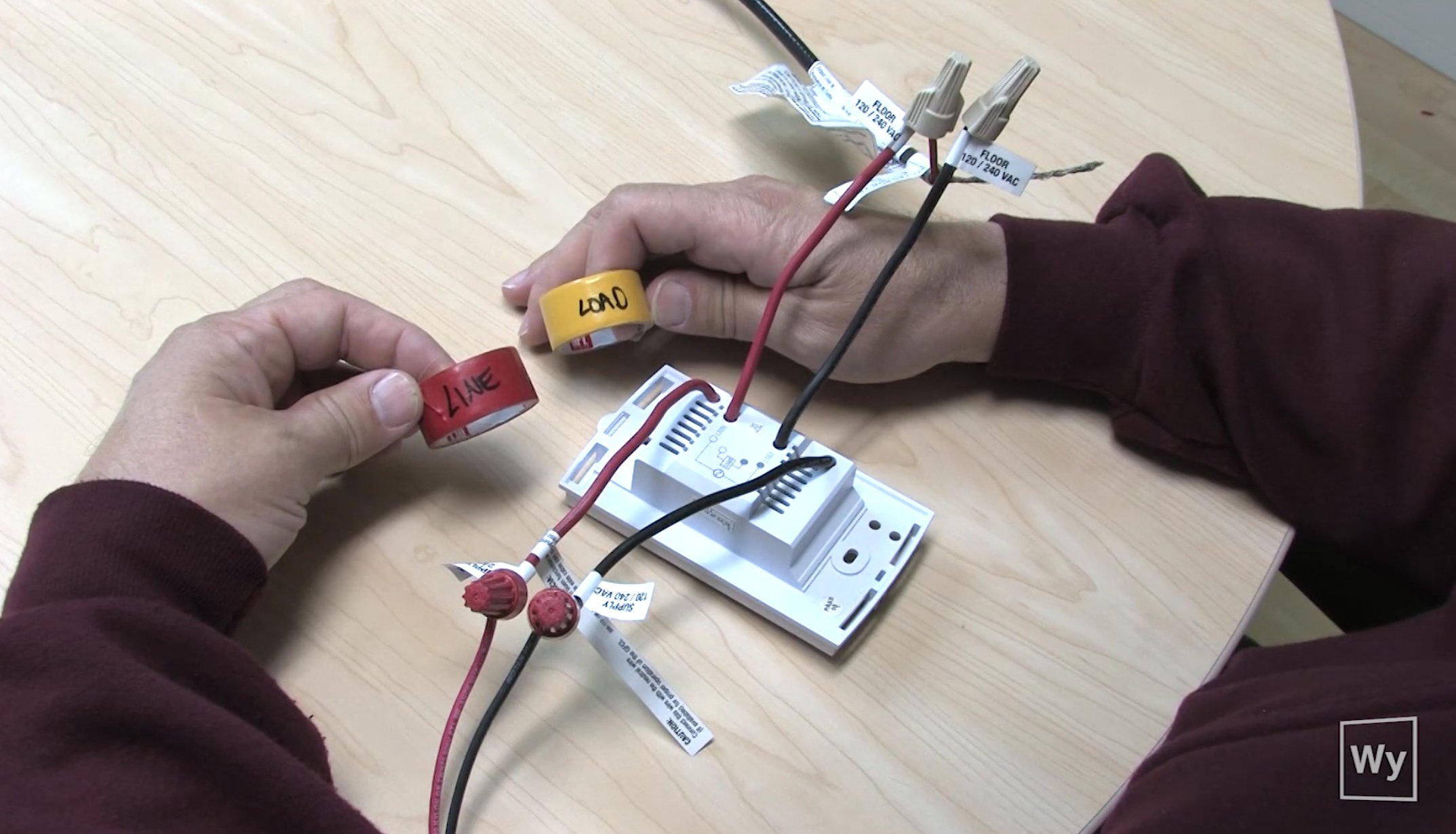 Once the base is removed, mark the wires with colored tape to note which ones are load (or floor) wires and which ones are line wires. Then, disconnect the wires.