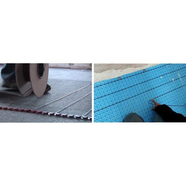 Fixing strips have to be adhered to the subfloor. For wood subfloors, this means screwing or nailing the strips to the floor through the existing holes in the plastic. For concrete subfloors, the fixing strips should be adhered to the underlayment using double-sided tape. Once the fixing strips are secure, the installer must weave the cable back and forth between the fixing strips.