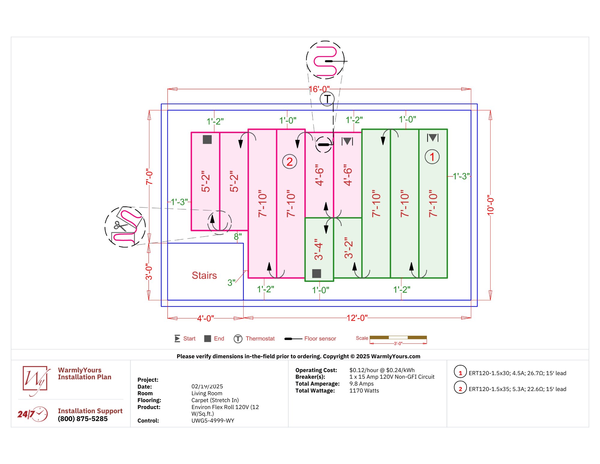 You can use the Instant Quote Tool, which gives you many options for your floor heating coverage. Use this interactive tool to design your room online and receive an instant quotation with product recommendations, rough-in and installation kits, cost of your control, etc. Planning your floor heating project is made easy when using our Instant Quote Tool.
