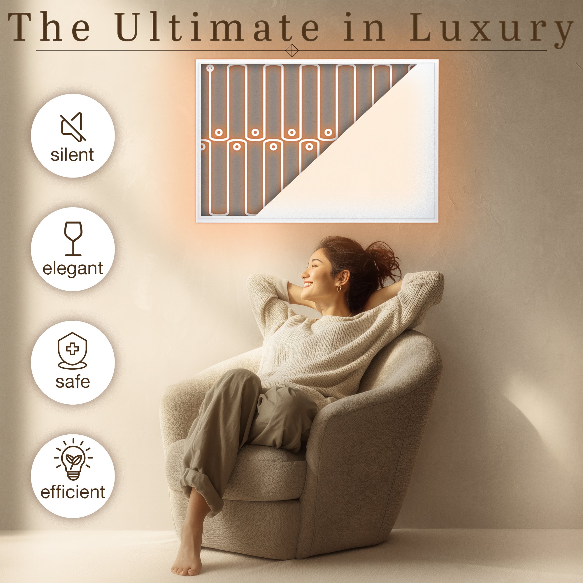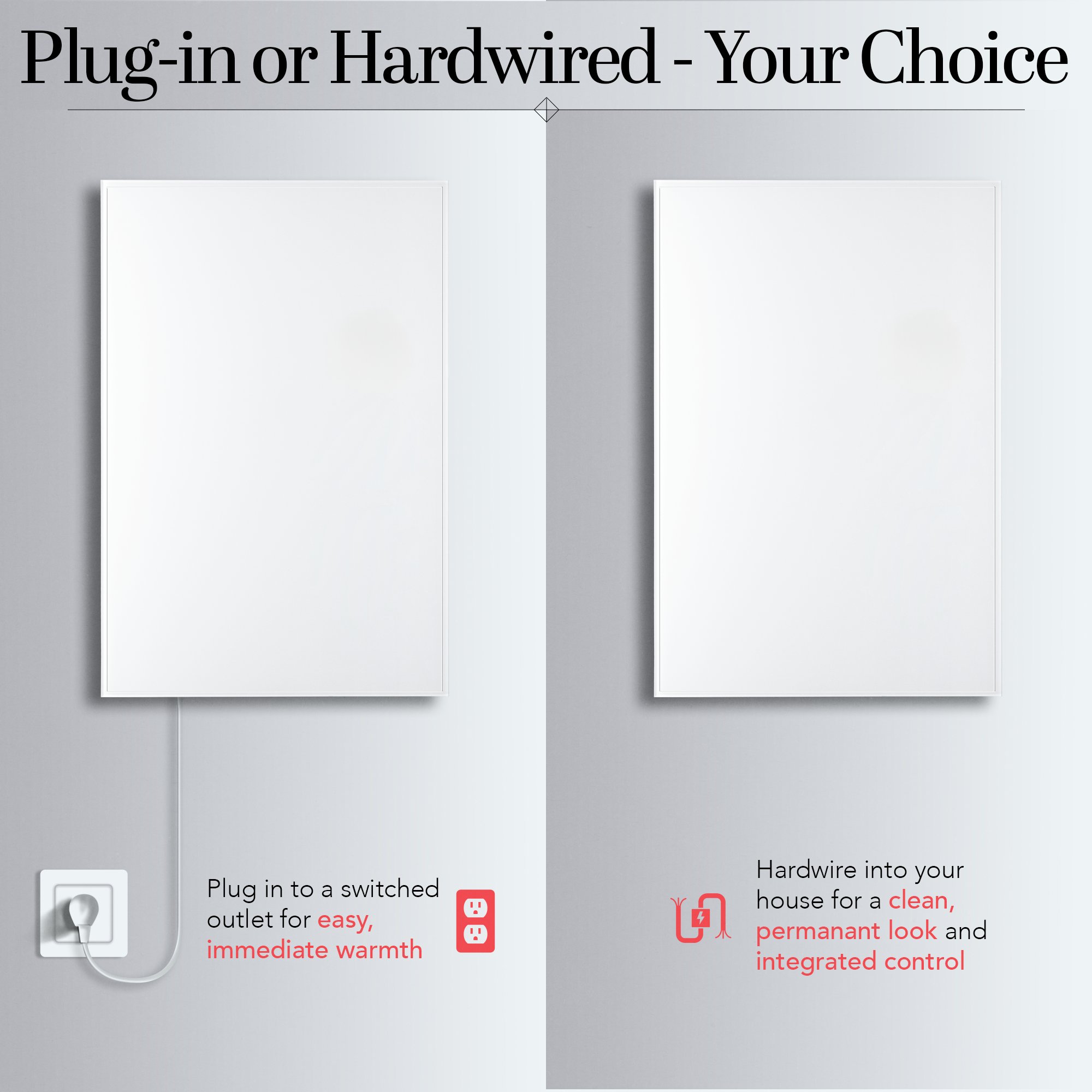 Infrared radiant heating panels, like the ones from our Ember Flex line, offer a unique and aesthetically pleasing, and safe, alternative to traditional space heaters. An Ember Flex radiant panel heater is an attractive and affordable way to add much needed supplemental warmth to hard to heat rooms in your home. These panels use infrared waves to efficiently transfer radiant energy to solid objects, which is similar to how the sun warms objects. With its white finish and integrated frame, this panel functions not only as a reliable heating device, but also as a design element. These panels are also dual connection, meaning they can be used “as is” to plug into a standard 120 VAC outlet or they can be modified by a licensed electrician to have a hardwired 120 VAC electrical connection.