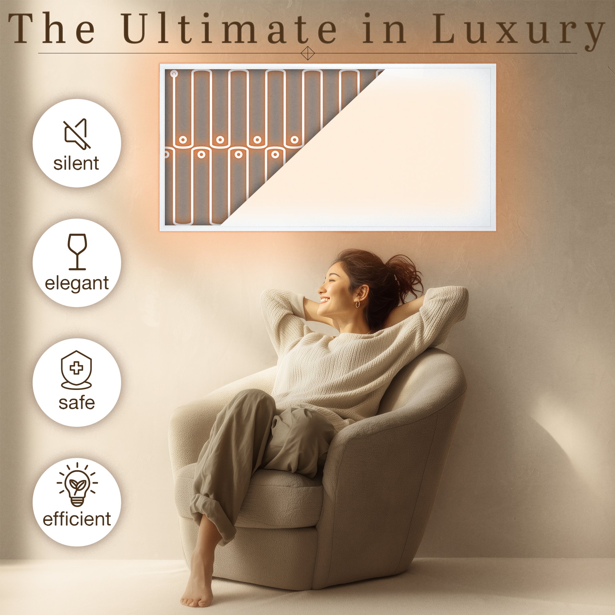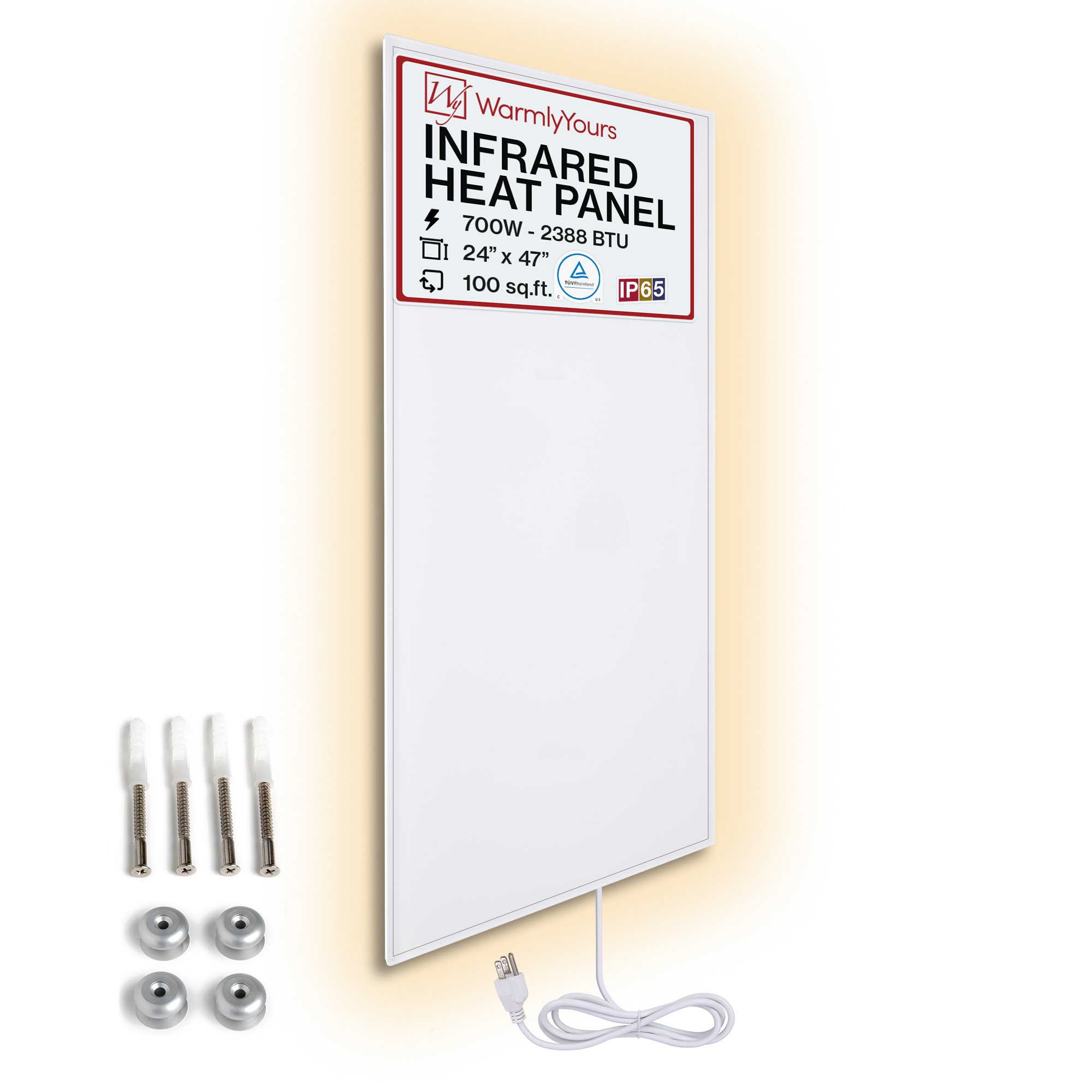 This panel is 47” by 24” and can be installed vertically or horizontally on your wall. Additionally, it can also be used horizontally with a low-profile stand accessory (sold separately—for plug-in models only) to create a movable heat source. This panel also comes with all of the hardware necessary to attach it to your ceiling. These panels are also unique in that they have one of the highest possible efficiency rates and consume the least amount of energy possible*.