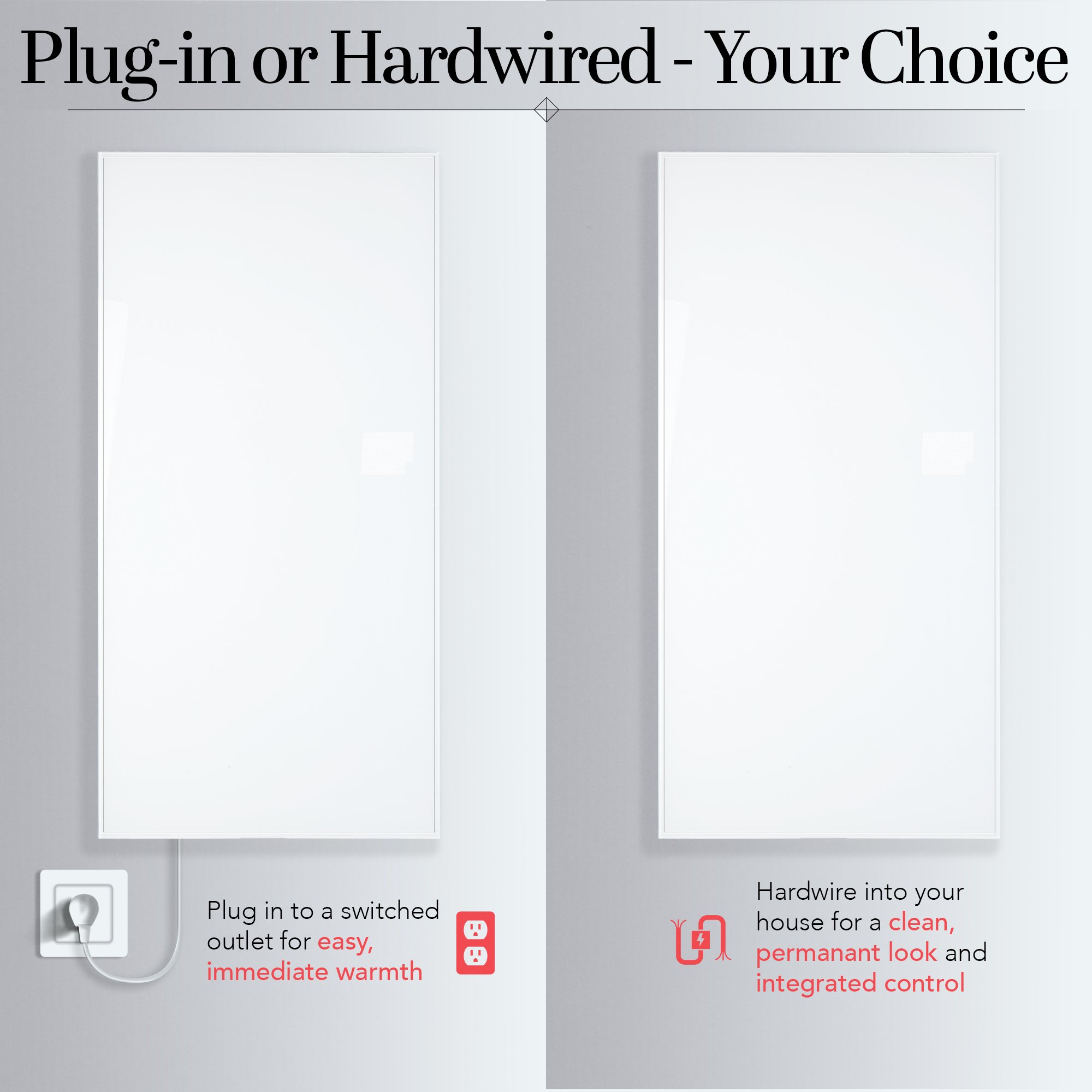 Every home in a colder climate will have areas that are cooler than others. Unfortunately, the solutions for heating these problem areas have been limited to wastefully (and uncomfortably) turning up the heat for the entire home or relying on unattractive and potentially dangerous space heaters. Our Ember Flex radiant panel heaters offer an aesthetically pleasing and energy efficient alternative way to maximize your comfort. Like the sun, these panels use infrared waves to transmit radiant heat to solid objects. And with the integrated frame and white finish, they’re not only functional but also beautiful. These panels are also dual connection, meaning they can be used “as is” to plug into a standard 120 VAC outlet or they can be modified by a licensed electrician to have a hardwired 120 VAC electrical connection.