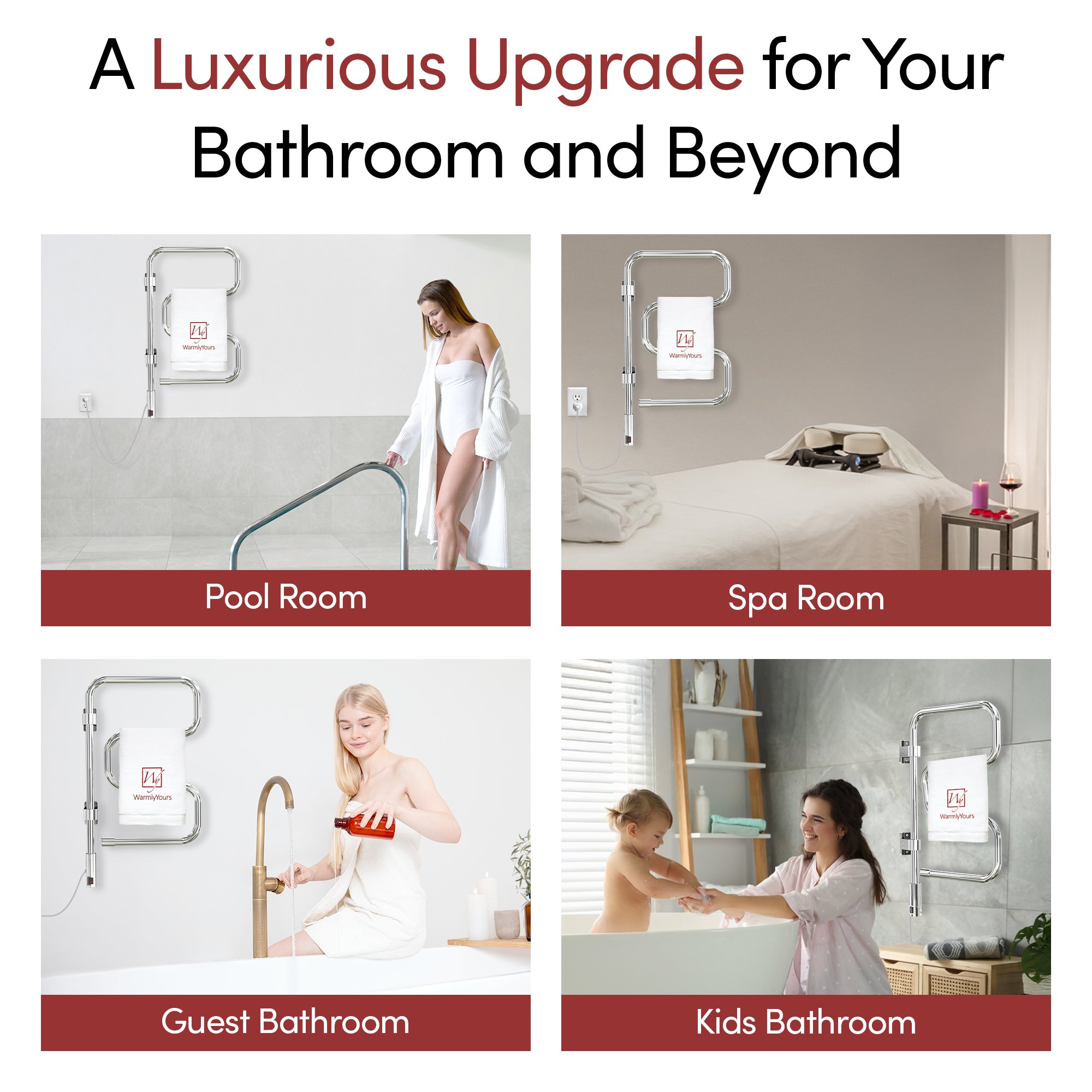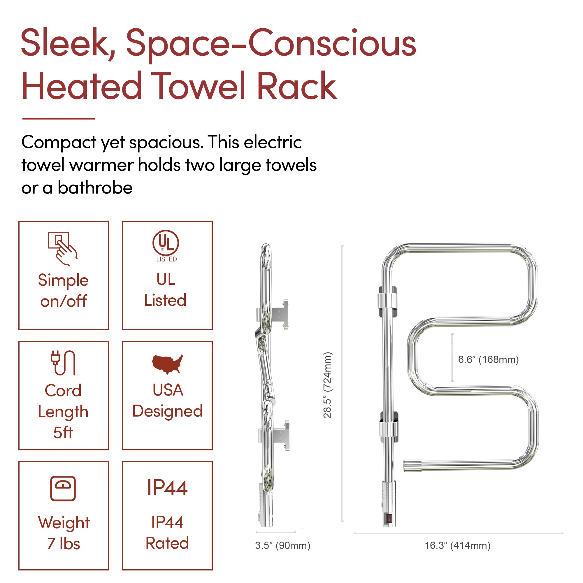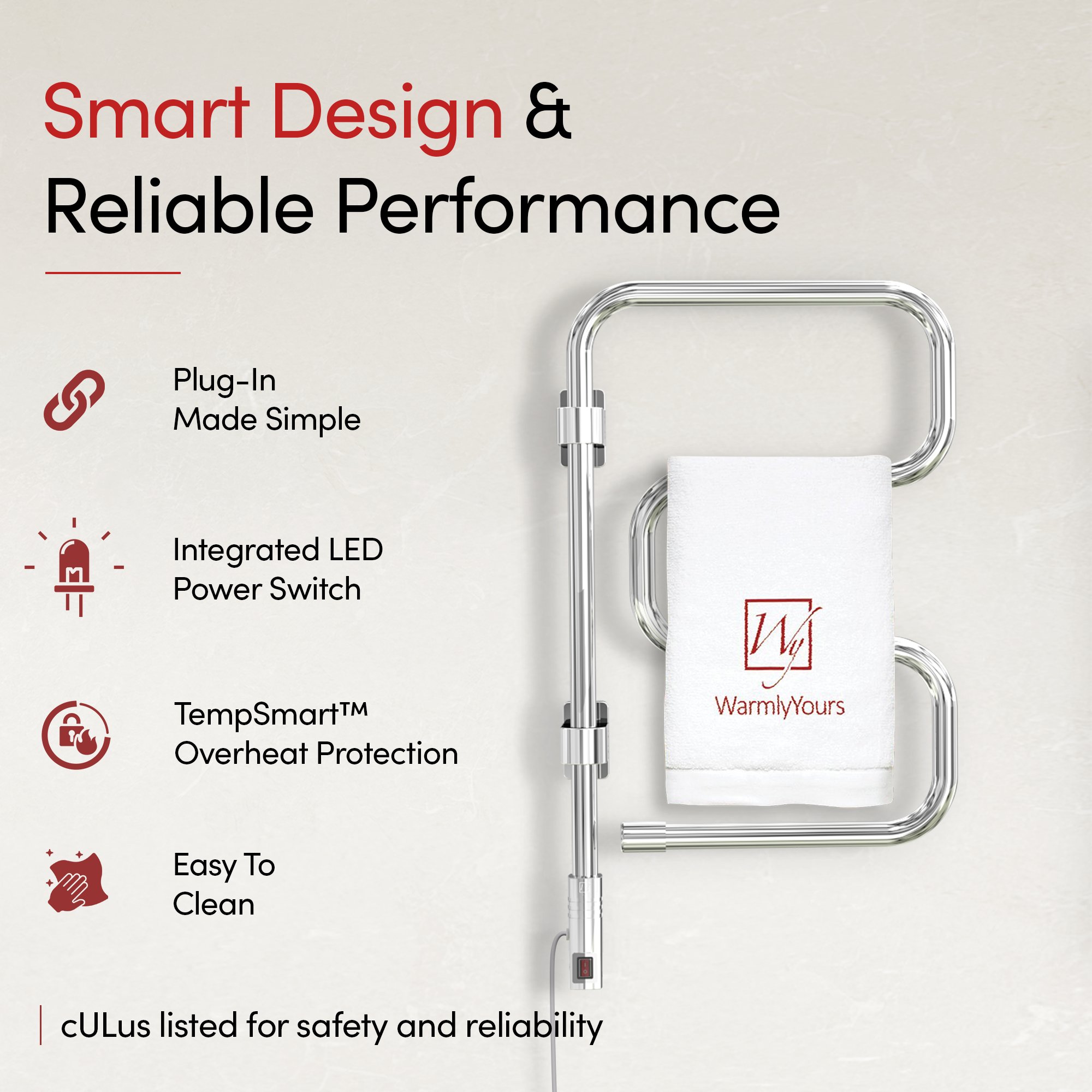 Looking for the comfort of heated towels, but limited on space? The WarmlyYours Elements Towel Warmer is what you are looking for. At 16.3”W x 28.5”H x 3.5”D, it has a smaller profile and takes up less wall space. The Elements towel warmer features four rounded bars that pivot on wall mounts, allowing for convenient access when you need it and compact storage when you don’t. The polished finish on this chrome towel warmer makes the unit easy to clean. At 120 volts, it plugs into a standard household outlet and is operated with a built-in on/off switch. The Elements Towel Warmer generates 60 watts to gently heat a large bath towel. It makes a great addition to any sized bathroom or budget. The polished finish on this chrome towel warmer makes the unit easy to clean.