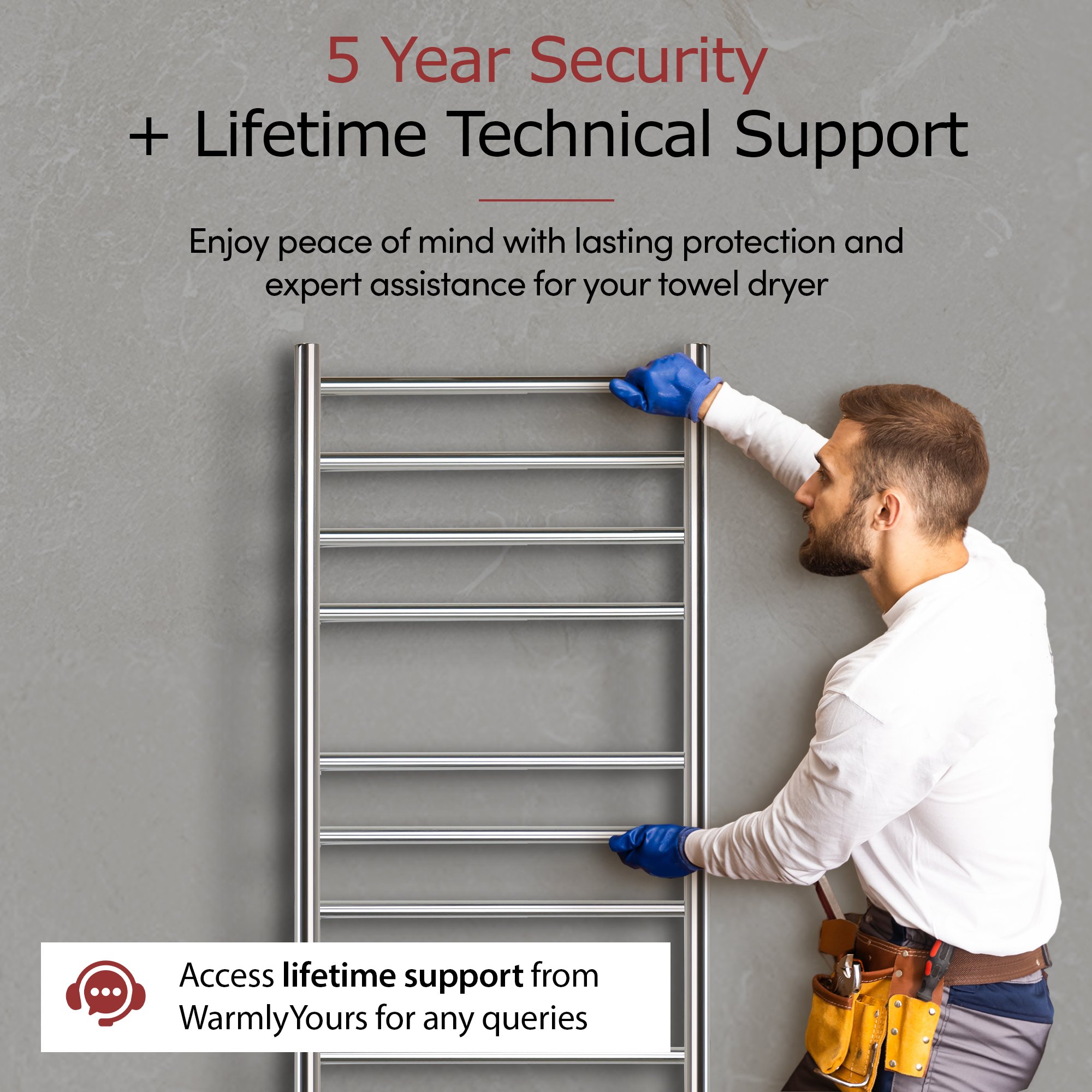 WarmlyYours does not provide repair services for this product; we only offer replacement hardware kits (brackets, screws, accessories) and on/off switches, as the main heating element is not available as a spare part, meaning that if your towel warmer fails during the warranty period, we will replace the entire unit in accordance with our warranty policy, and our technical support team is available 24/7 by phone to assist you with installation and troubleshooting; for more details, please consult our Return Policy, this notice being provided in accordance with Quebec's Consumer Protection Act, Article 39 (as amended in 2025).