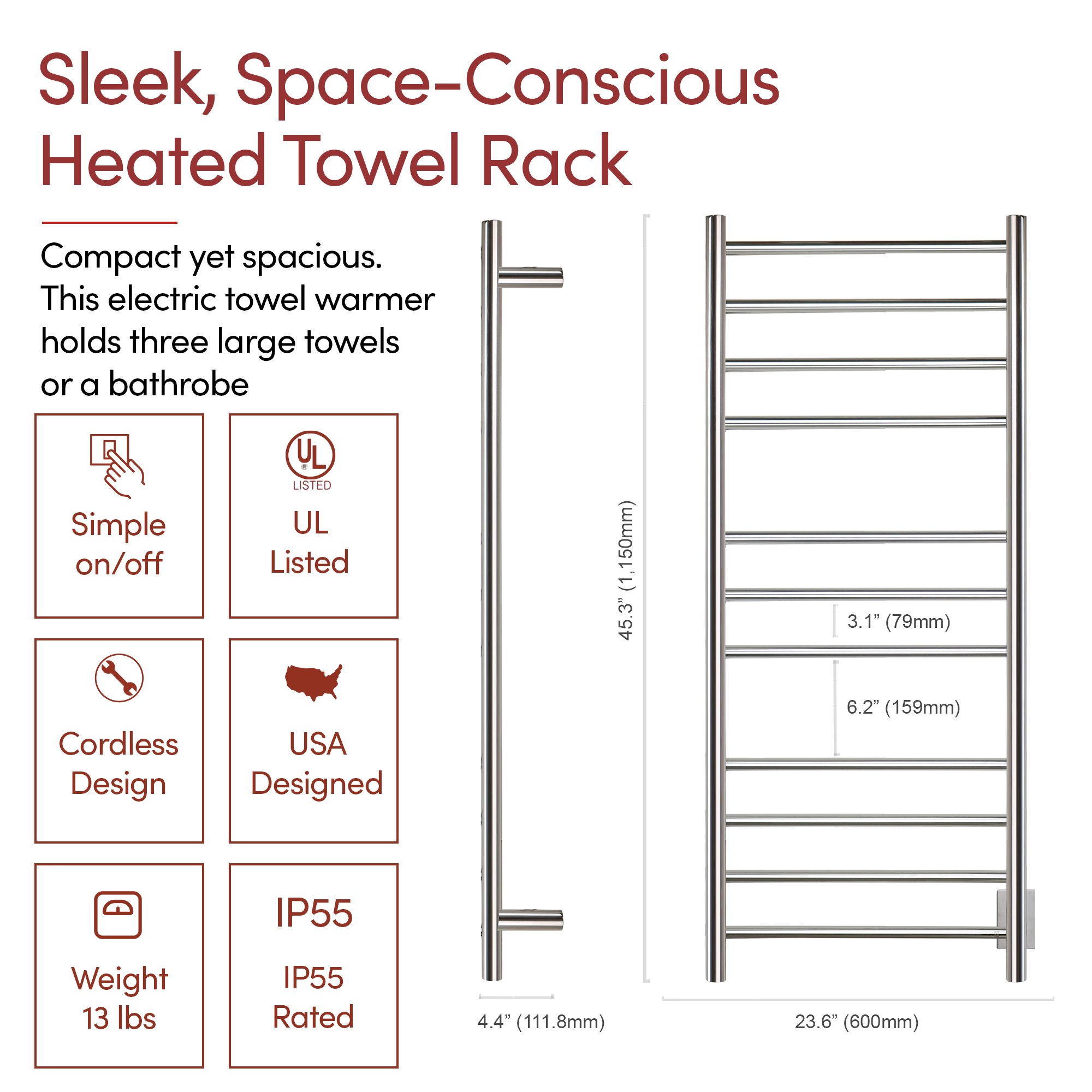 - Generous 11-Bar Design: The Ontario XL towel warmer uses 11 polished stainless steel bars to evenly distribute heat, warming up to 2 large towels or bathrobes