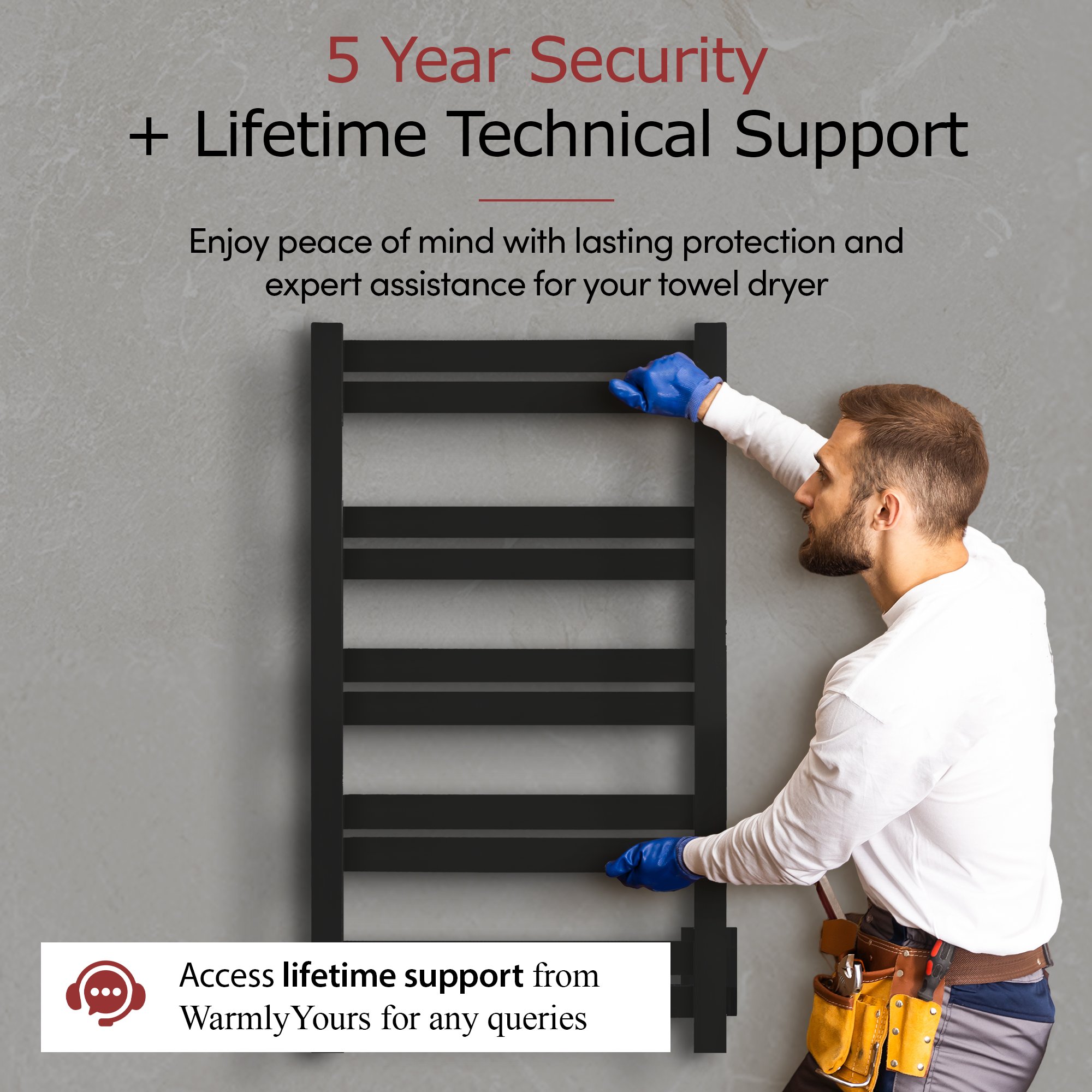 WarmlyYours does not provide repair services for this product; we only offer replacement hardware kits (brackets, screws, accessories) and on/off switches, as the main heating element is not available as a spare part, meaning that if your towel warmer fails during the warranty period, we will replace the entire unit in accordance with our warranty policy, and our technical support team is available 24/7 by phone to assist you with installation and troubleshooting; for more details, please consult our Return Policy, this notice being provided in accordance with Quebec's Consumer Protection Act, Article 39 (as amended in 2025).