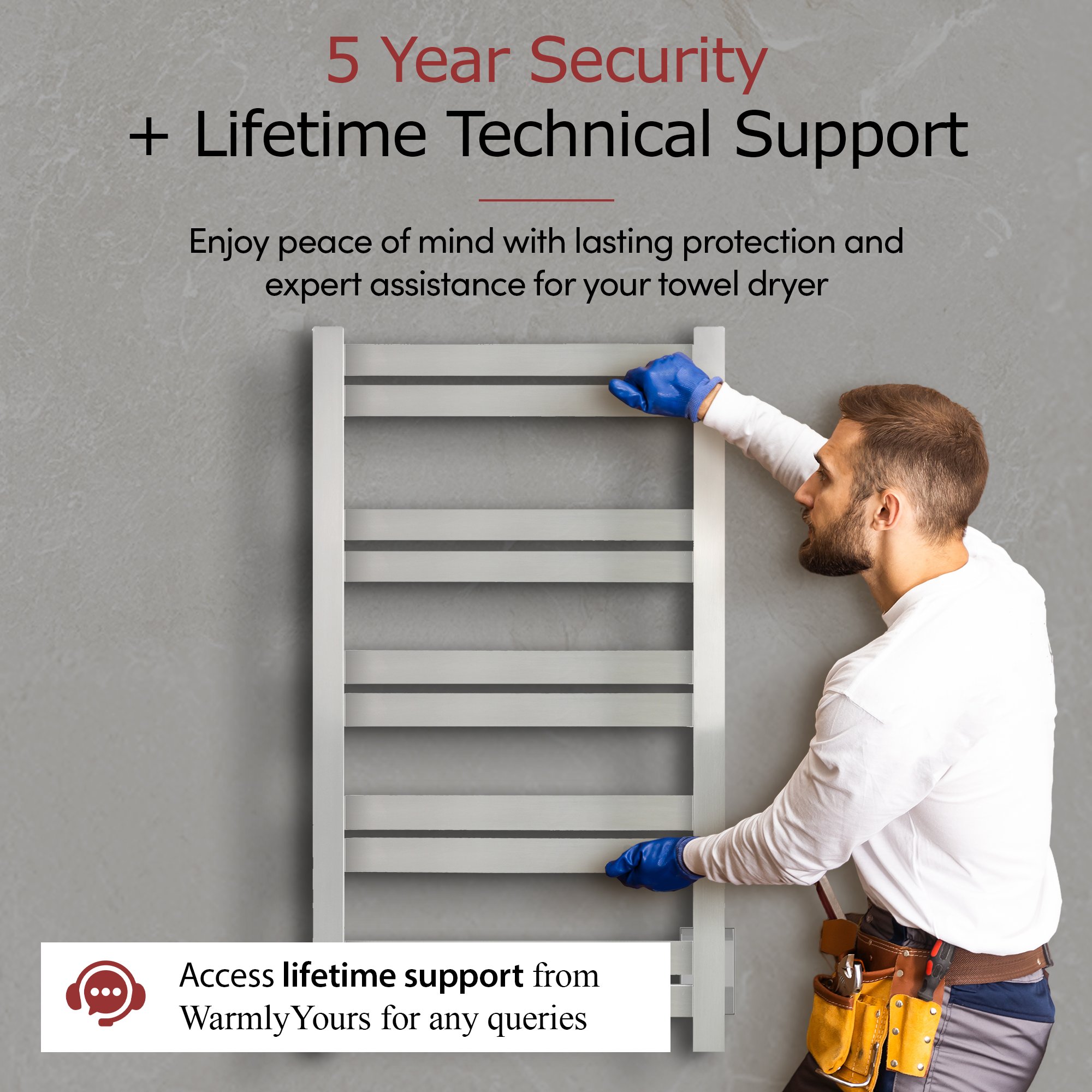 WarmlyYours does not provide repair services for this product; we only offer replacement hardware kits (brackets, screws, accessories) and on/off switches, as the main heating element is not available as a spare part, meaning that if your towel warmer fails during the warranty period, we will replace the entire unit in accordance with our warranty policy, and our technical support team is available 24/7 by phone to assist you with installation and troubleshooting; for more details, please consult our Return Policy, this notice being provided in accordance with Quebec's Consumer Protection Act, Article 39 (as amended in 2025).