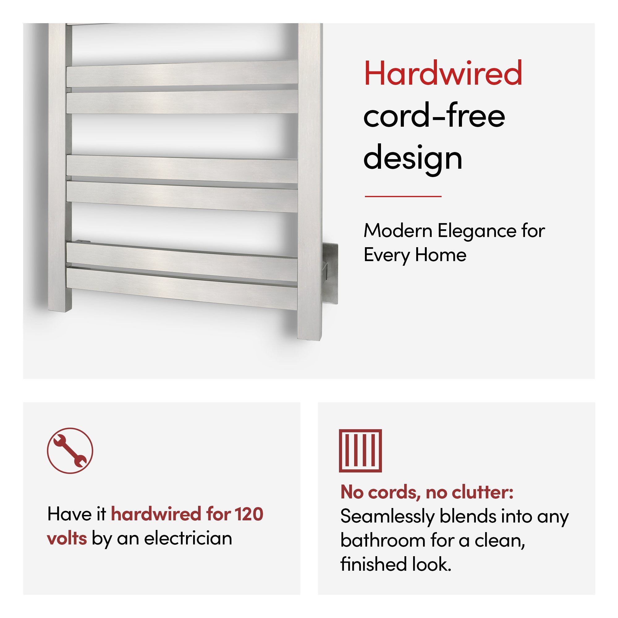 Hardwired: Wall-mounted with cord-free design, the Grande 12 hangs beautifully in any bathroom and is hardwired for 120 volts