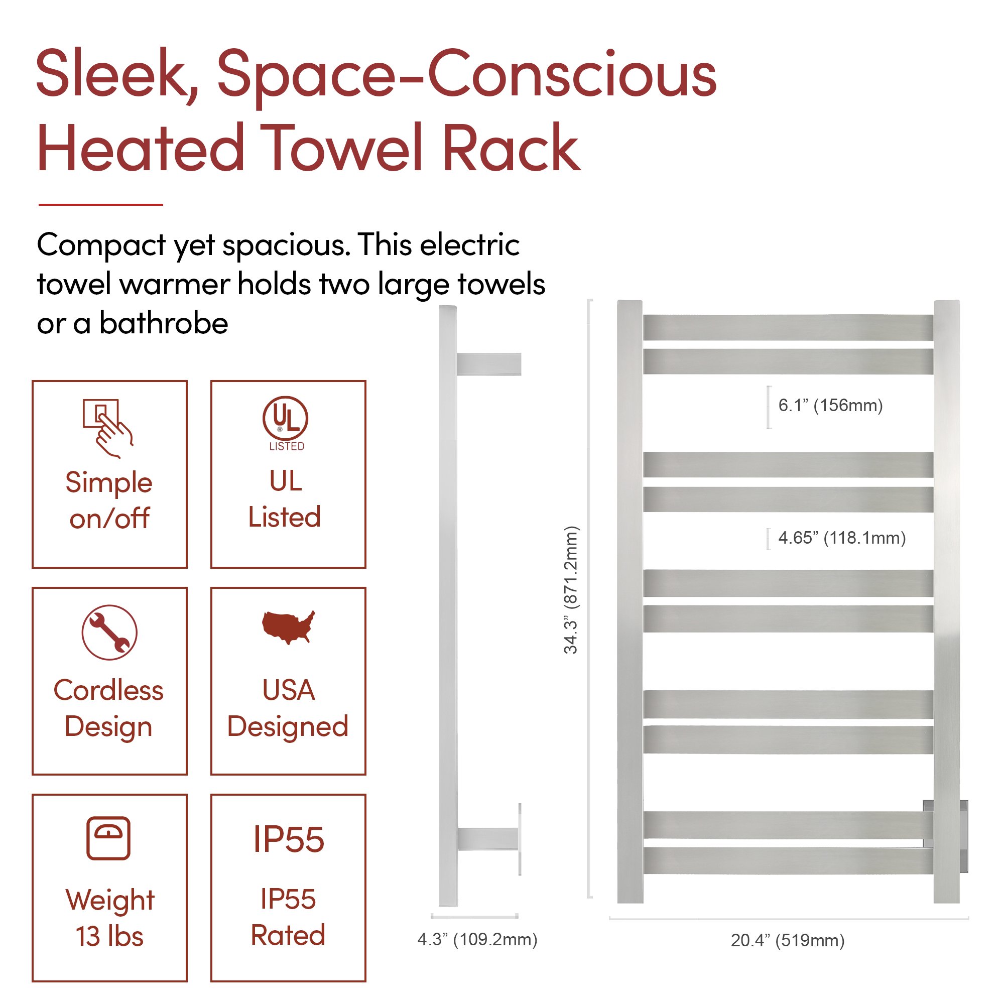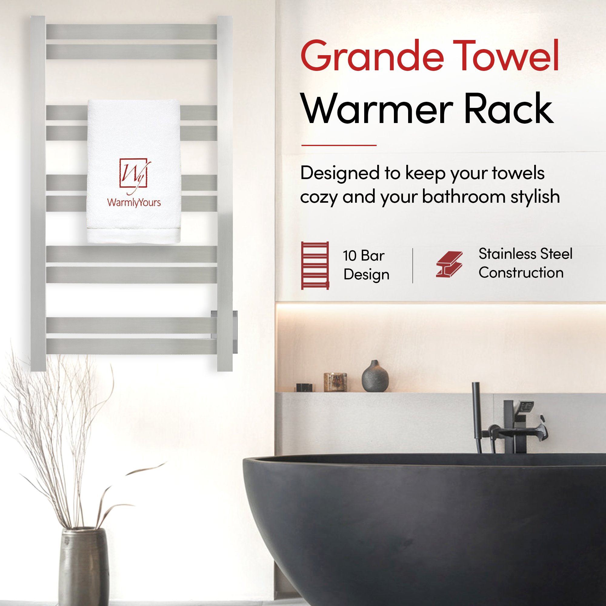 Generous 12-Bar Design: The Grande 12 towel warmer uses 12 matte black stainless steel bars to evenly distribute heat, warming up to 2 large towels or bathrobes