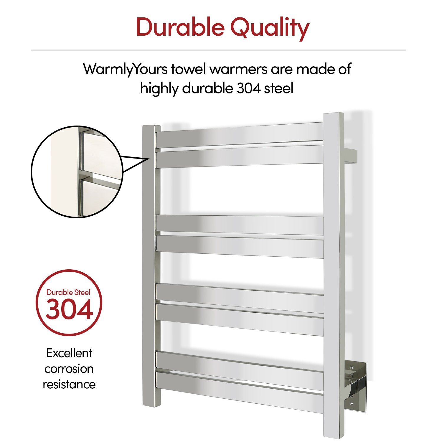 The Maple towel warmer from WarmlyYours combines a unique design with impressive functionality. This wall-mounted towel warmer features 8 heated, flat bars which allows the Maple to provide a heat output of 358 BTUs per hour. The flat bars of this heated towel rack have more surface area than traditional round or square bars for expedient heating of your towels or bathrobes. The design also incorporates a spacing that allows the top pair of bars to perfectly accommodate hand towels. The hardwired connection (120 VAC) of the Maple will ensure no visible wires or cords. This version of the Maple comes with a beautiful, polished finish and durable 304-stainless steel construction. This model comes with built-in TempSmart™ overheat protection to prevent the unit’s surface temperature from exceeding 149°F (65°C).