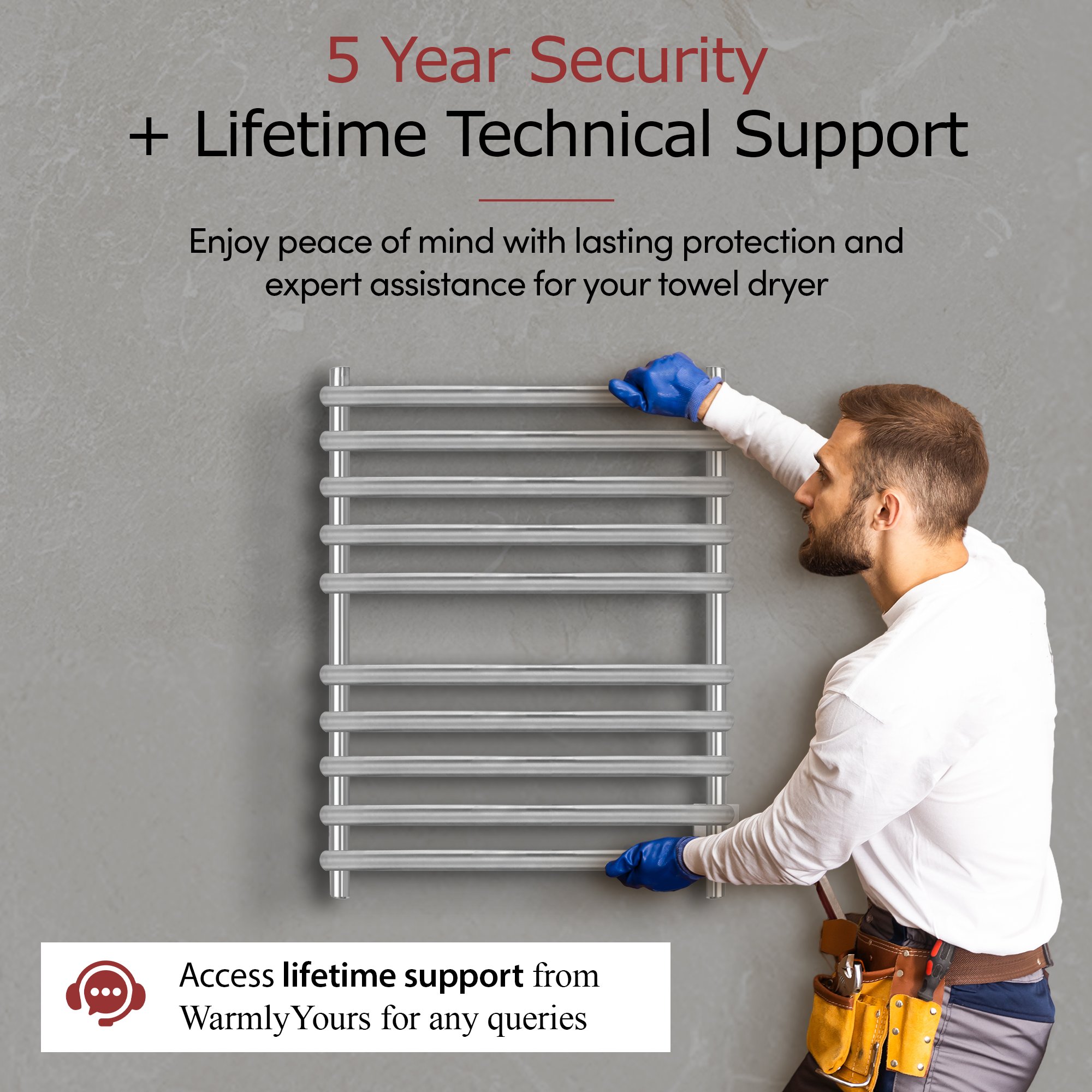 WarmlyYours does not provide repair services for this product; we only offer replacement hardware kits (brackets, screws, accessories) and on/off switches, as the main heating element is not available as a spare part, meaning that if your towel warmer fails during the warranty period, we will replace the entire unit in accordance with our warranty policy, and our technical support team is available 24/7 by phone to assist you with installation and troubleshooting; for more details, please consult our Return Policy, this notice being provided in accordance with Quebec's Consumer Protection Act, Article 39 (as amended in 2025).