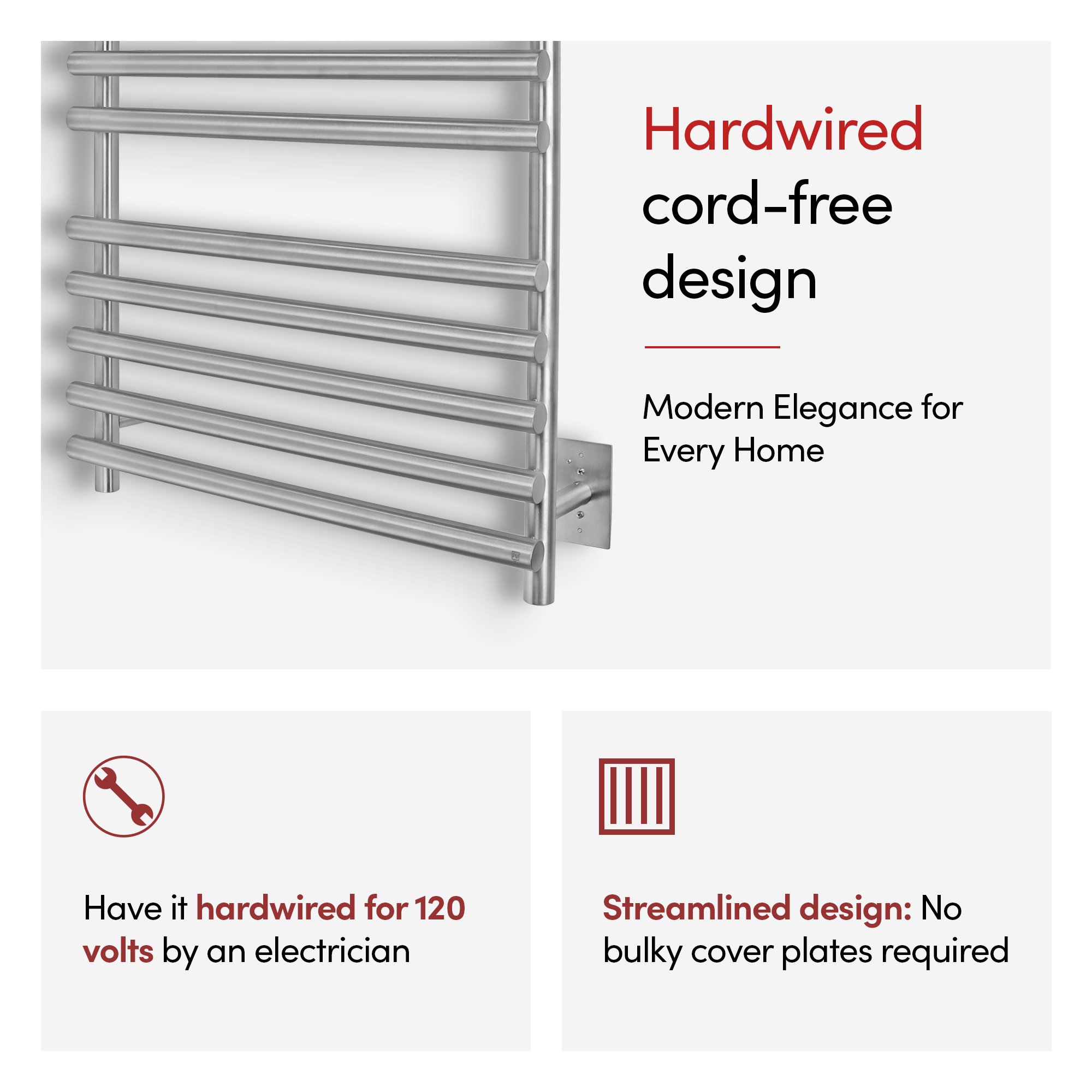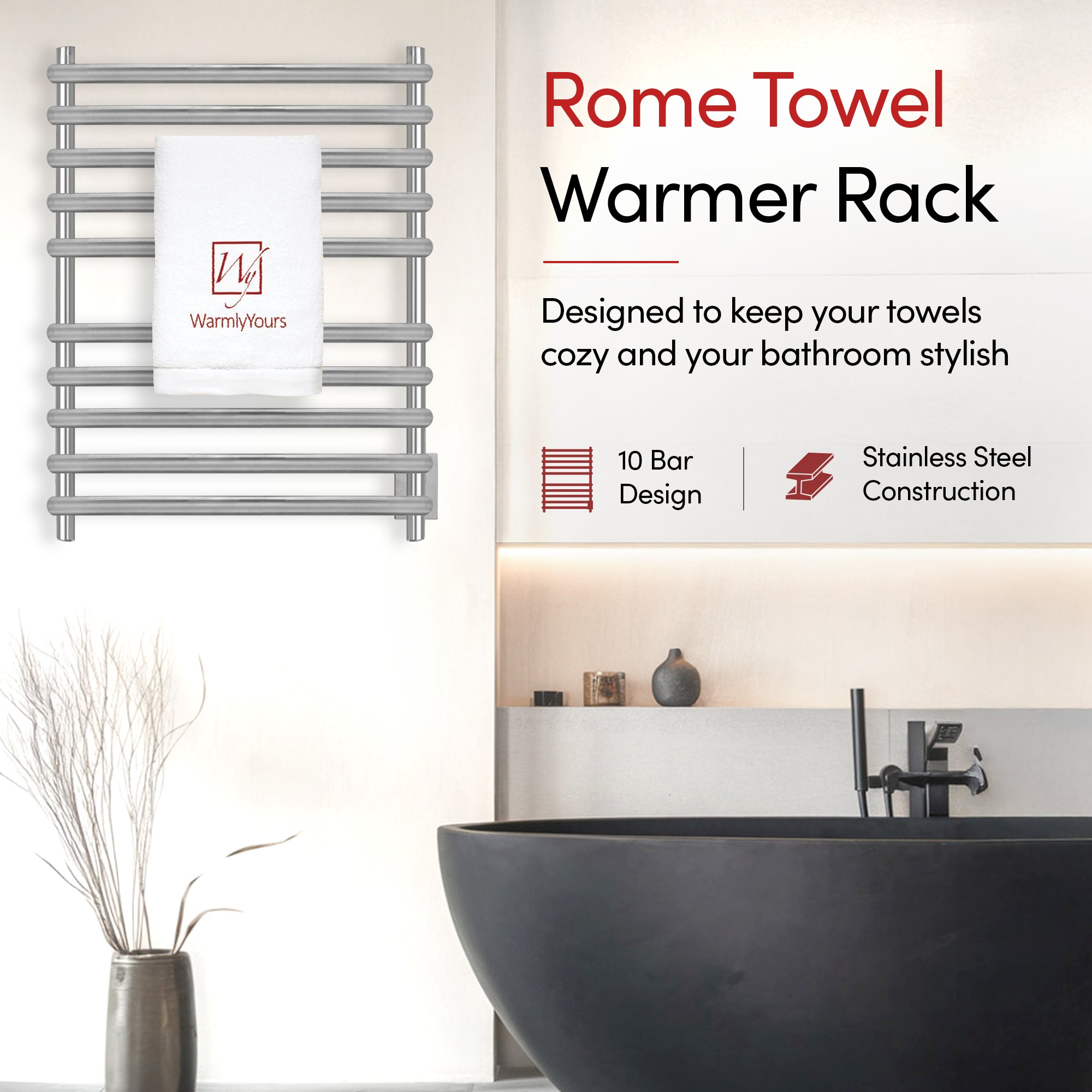 - Generous 10-Bar Design: The Rome towel warmer uses 10 brushed stainless steel bars to evenly distribute heat, warming up to 2 large towels or bathrobes