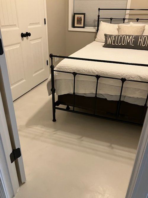 As Lonnie explained, "I installed a self-leveling topping and then an acrylic troweled finish on all the heated floors... Poured the leveler... one for the bedroom."
