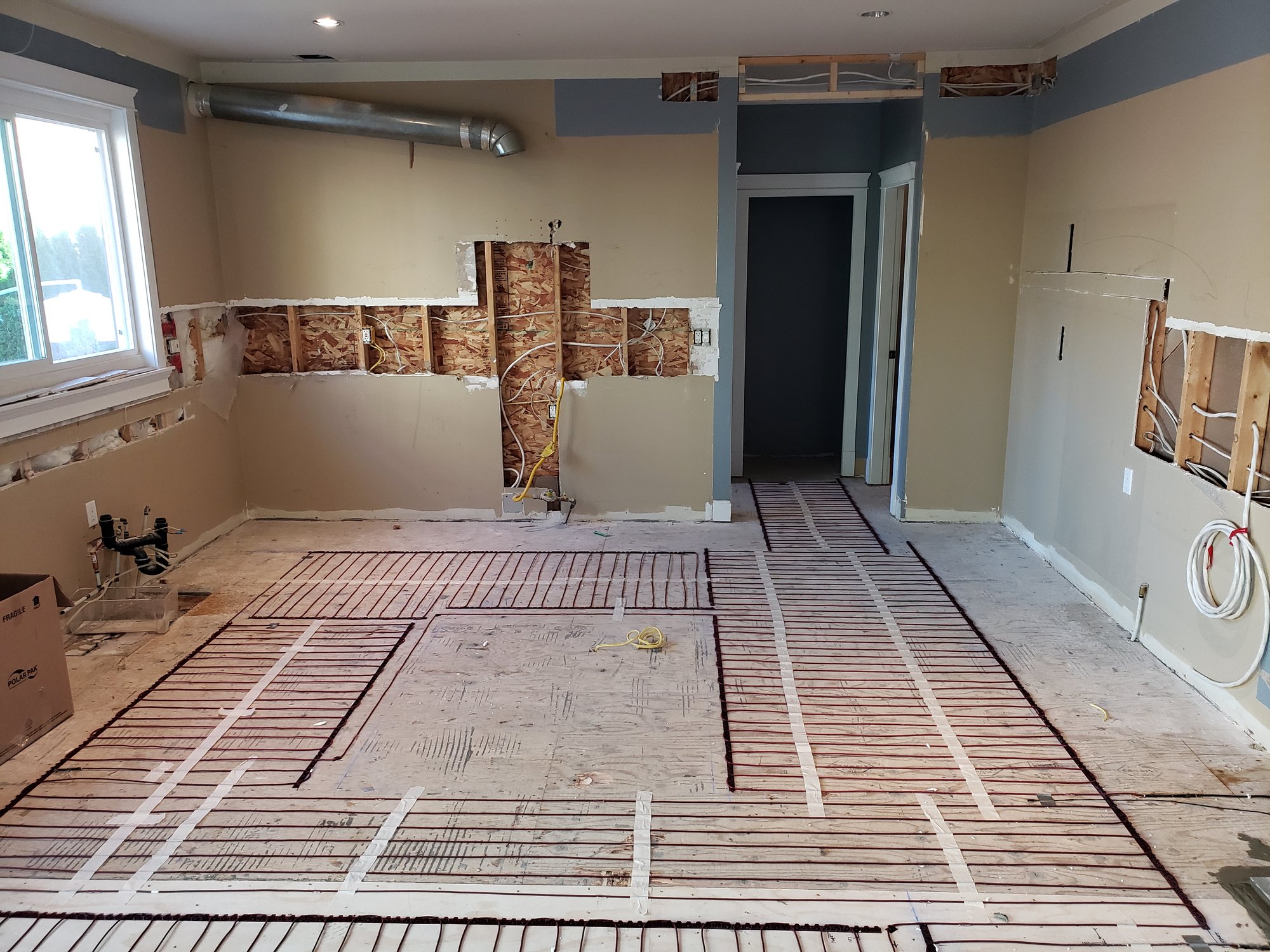 In many Pacific Northwest homes, the entryway and hallway are the first things you touch when you walk in the door. If those floors are cold, the whole house feels drafty. This project focused on a sprawling 327-square-foot layout spanning from the front door through the kitchen and into the powder room.