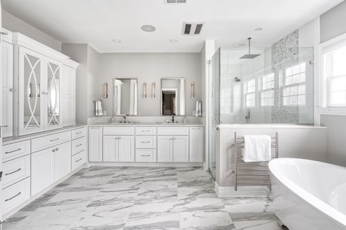When designing this beautiful master bathroom in Chatham, NJ, Kraftmaster Renovations aimed for a high-end finish that maximized comfort. Tile are durable and attractive floor coverings, but they are notoriously cold underfoot, especially in New Jersey winters. The homeowner wanted a comfort upgrade that addressed this problem without the noise and inefficiency of a forced-air register.