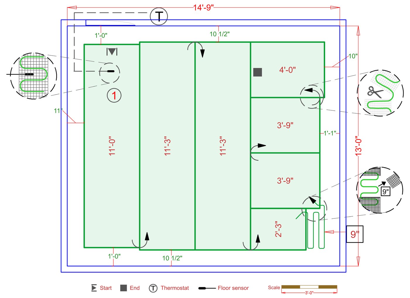 WarmlyYours offers a heating system for all of the most common flooring surfaces, including tile, stone, and marble. Each system type has unique advantages and best applications. Below you will find several different floor plans that are based on this example shower. Each breakdown is based on a different heating element and each breakdown will provide product information and costs. If you have any questions about which system type would be best for your project, you can contact us directly.