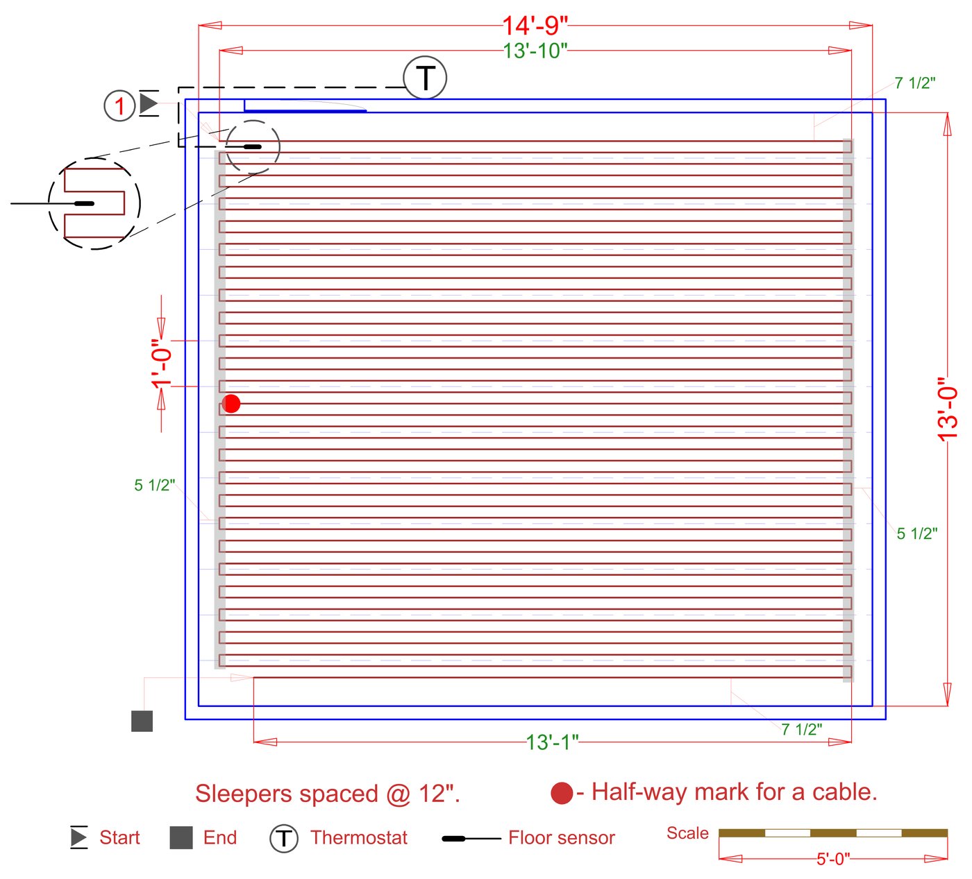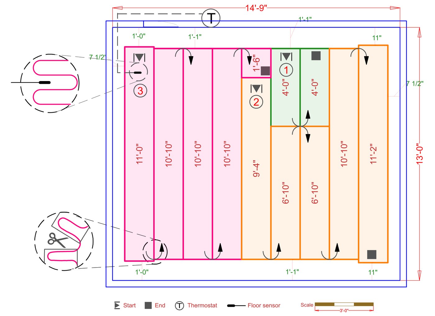 TempZone™ heated rolls consist of a heating cable secured onto a green mesh fabric with the heating cable distributed in serpentine loops. The cable loops are 3" apart, which helps deliver even heating throughout flooring areas, never leaving cold spots in the room.