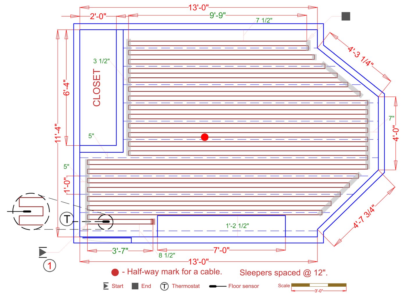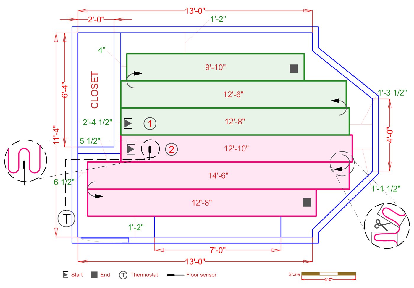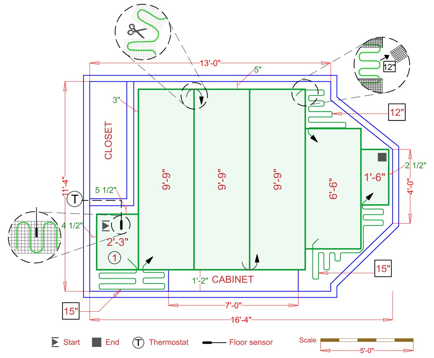 WarmlyYours offers a heating system for all of the most common flooring surfaces, including tile, stone, and marble. Each system type has unique advantages and best applications. Below you will find several different floor plans that are based on this example shower. Each breakdown is based on a different heating element and each breakdown will provide product information and costs. If you have any questions about which system type would be best for your project, you can contact us directly.