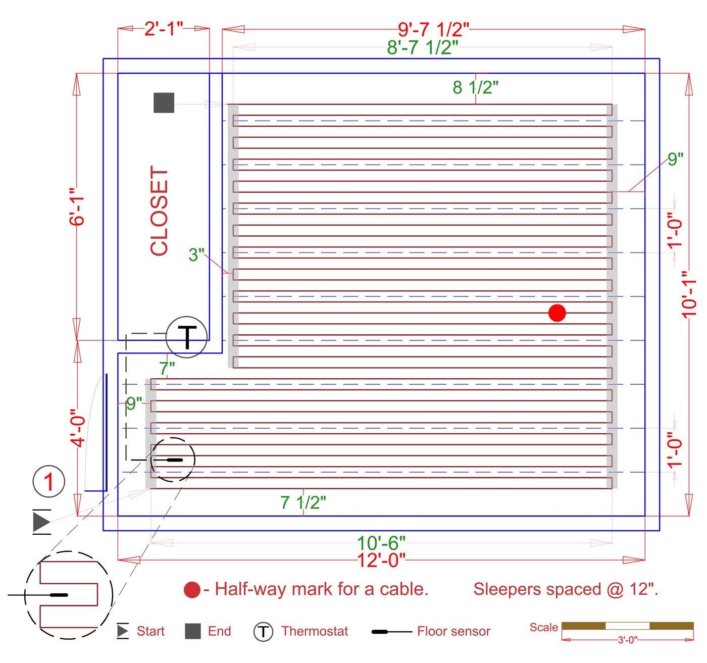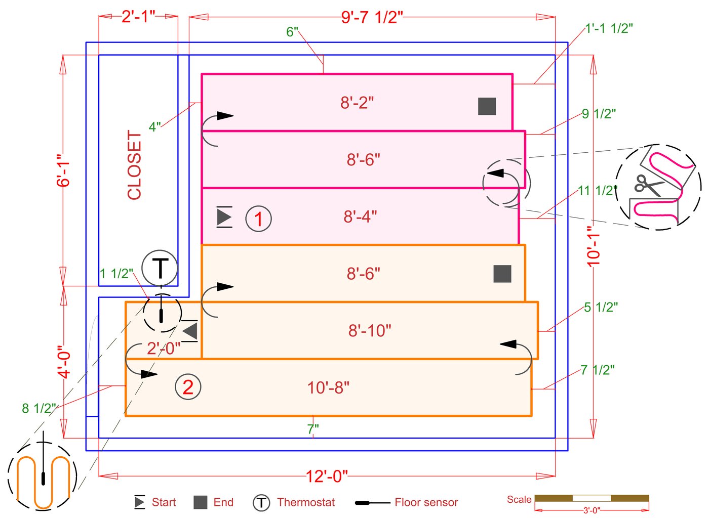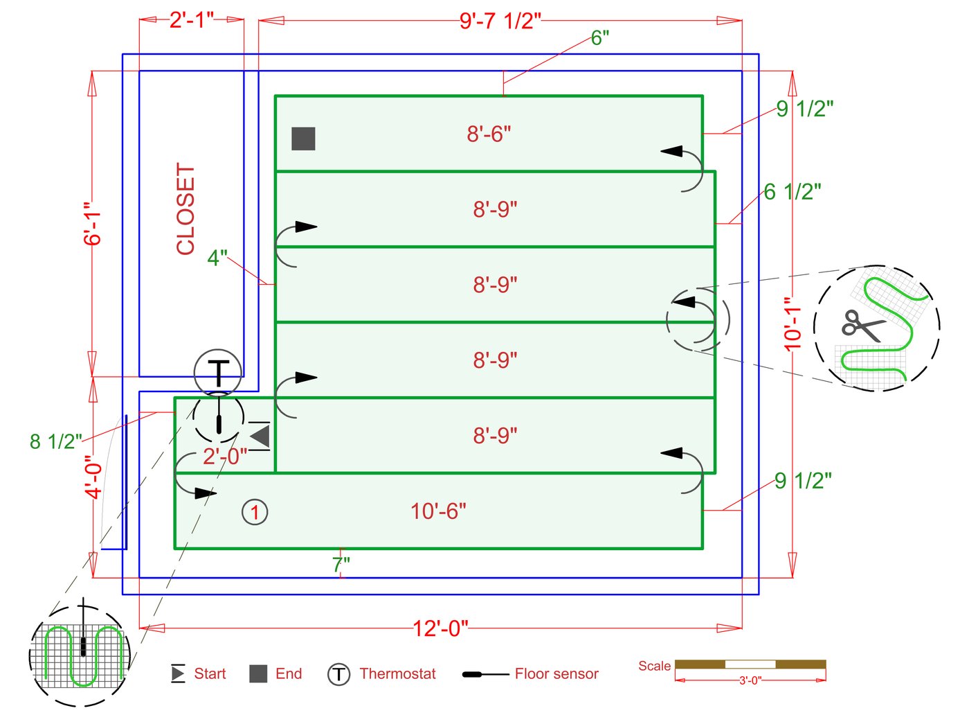 WarmlyYours offers a heating system for all of the most common flooring surfaces, including tile, stone, and marble. Each system type has unique advantages and best applications. Below you will find several different floor plans that are based on this example shower. Each breakdown is based on a different heating element and each breakdown will provide product information and costs. If you have any questions about which system type would be best for your project, you can contact us directly.