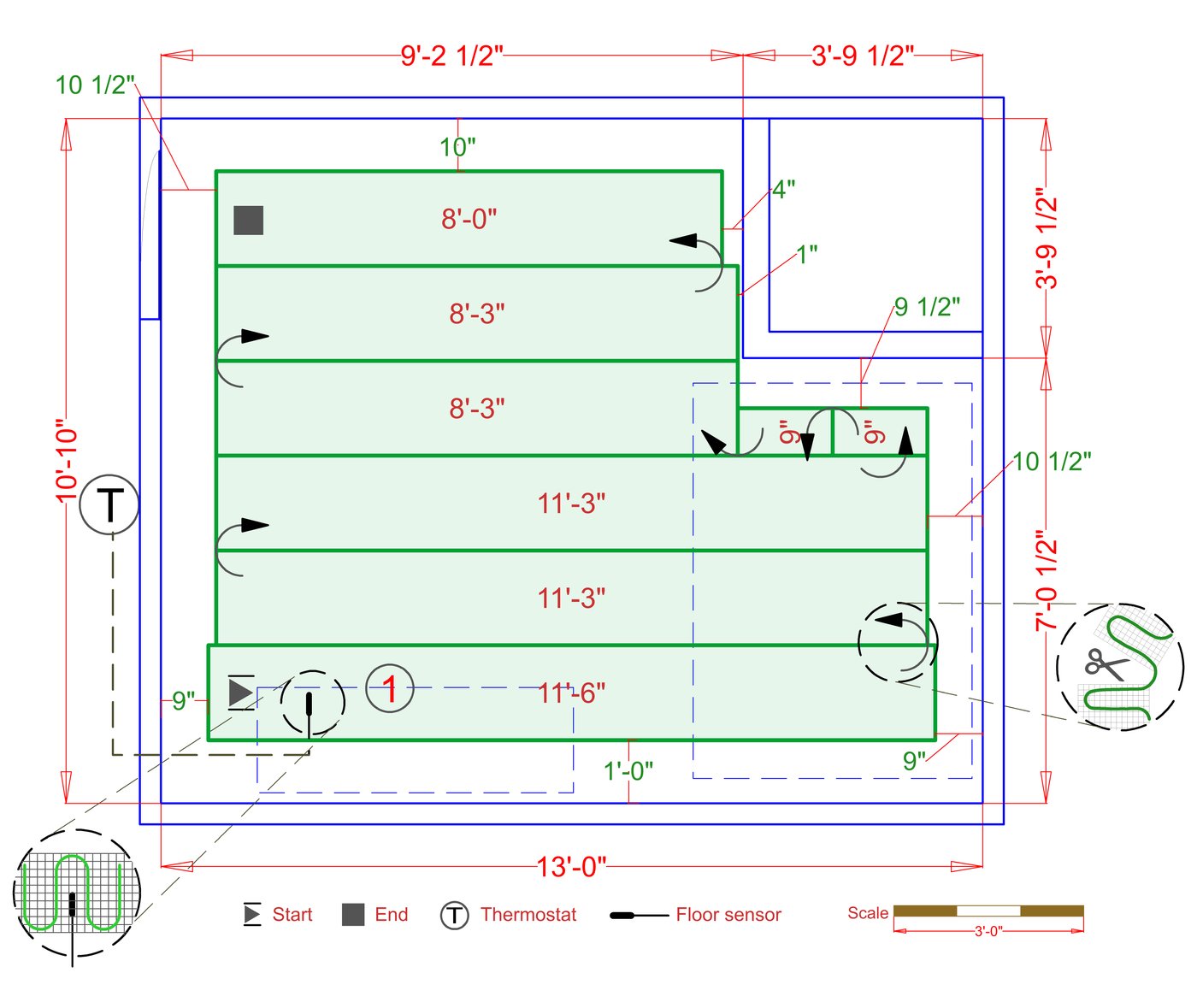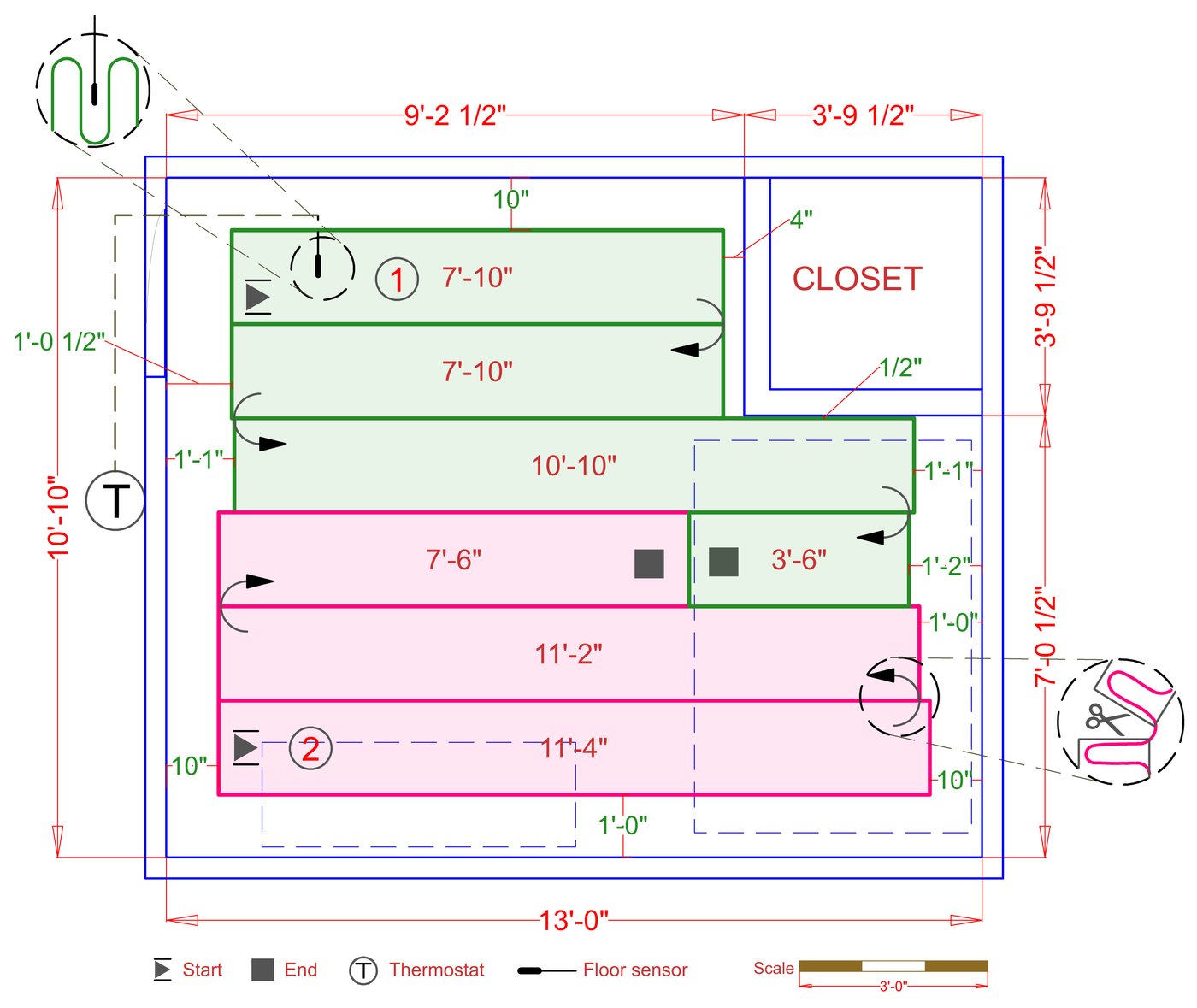 TempZone™ heated rolls consist of a heating cable secured onto a green mesh fabric with the heating cable distributed in serpentine loops. The cable loops are 3" apart, which helps deliver even heating throughout flooring areas, never leaving cold spots in the room.