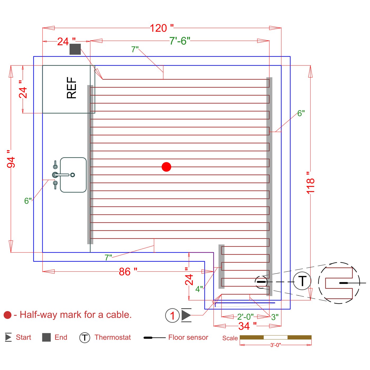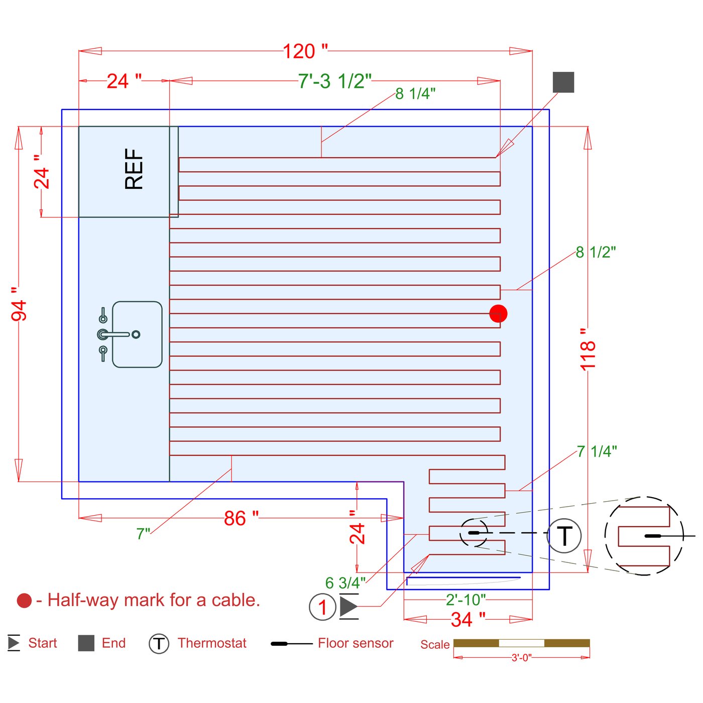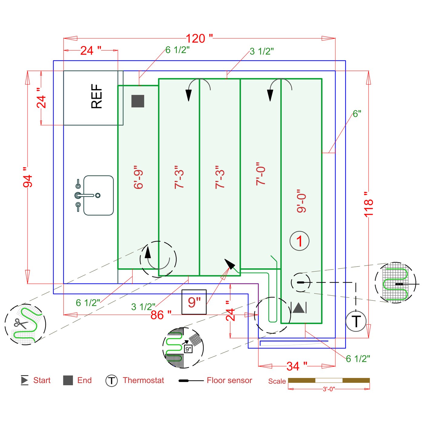 WarmlyYours offers a heating system for all of the most common flooring surfaces, including tile, stone, and marble. Each system type has unique advantages and best applications. Below you will find several different floor plans that are based on this example kitchen. Each breakdown is based on a different heating element and each breakdown will provide product information and costs. If you have any questions about which system type would be best for your project, you can contact usdirectly.Click on any of these available installation options below to see an example floor plan and project breakdown: