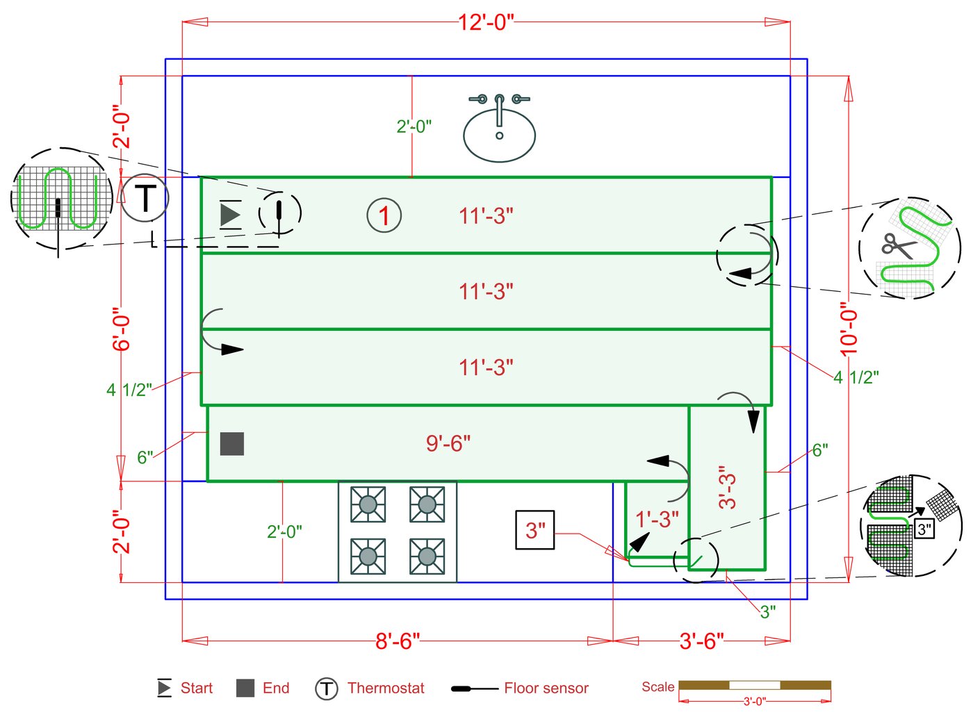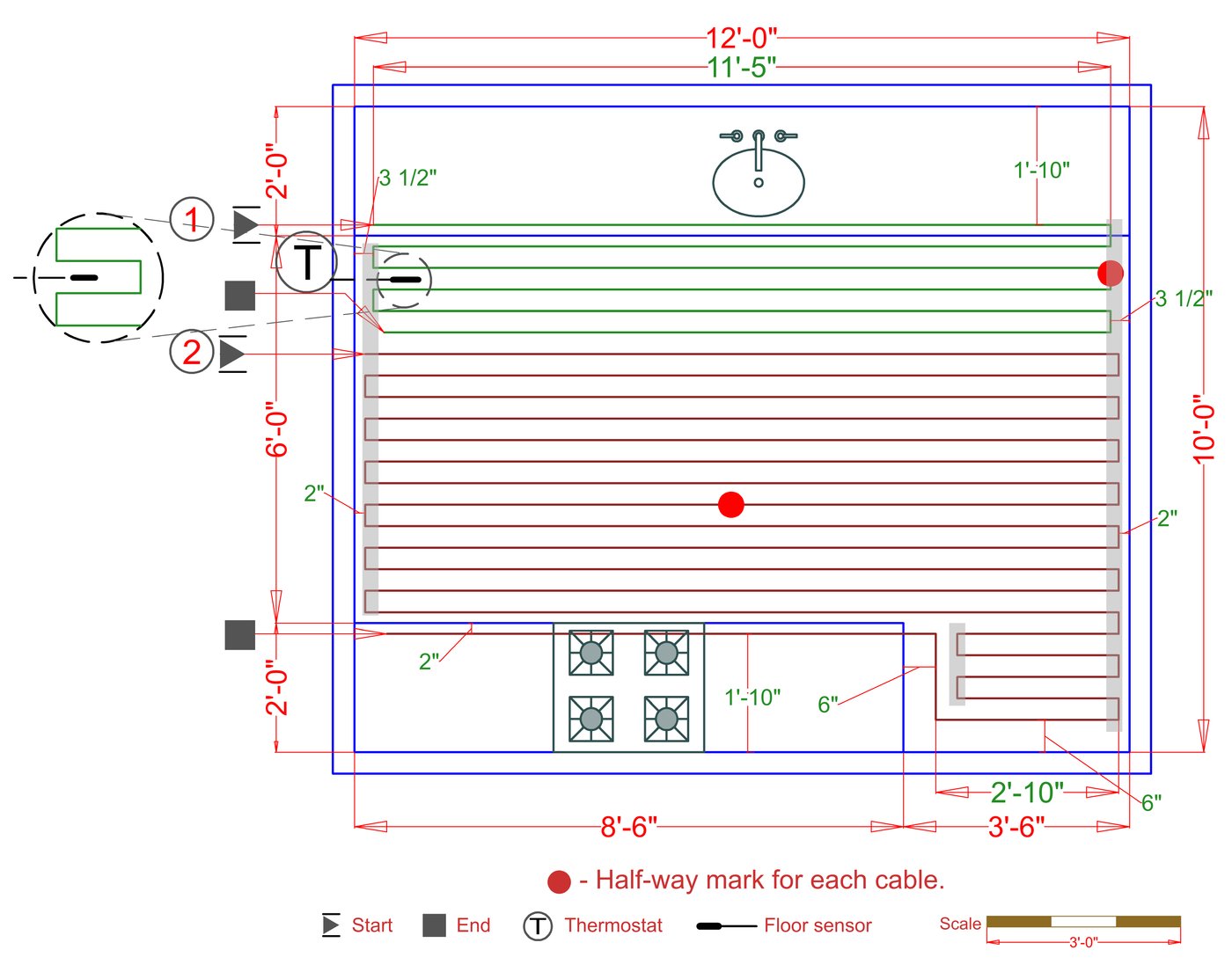 WarmlyYours offers a heating system for all of the most common flooring surfaces, including tile, stone, and marble. Each system type has unique advantages and best applications. Below you will find several different floor plans that are based on this example kitchen. Each breakdown is based on a different heating element and each breakdown will provide product information and costs. If you have any questions about which system type would be best for your project, you can contact usdirectly.Click on any of these available installation options below to see an example floor plan and project breakdown: