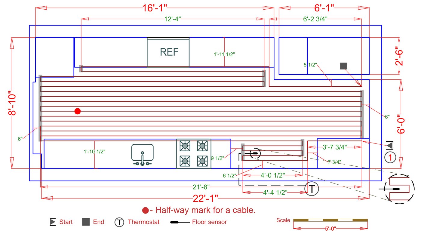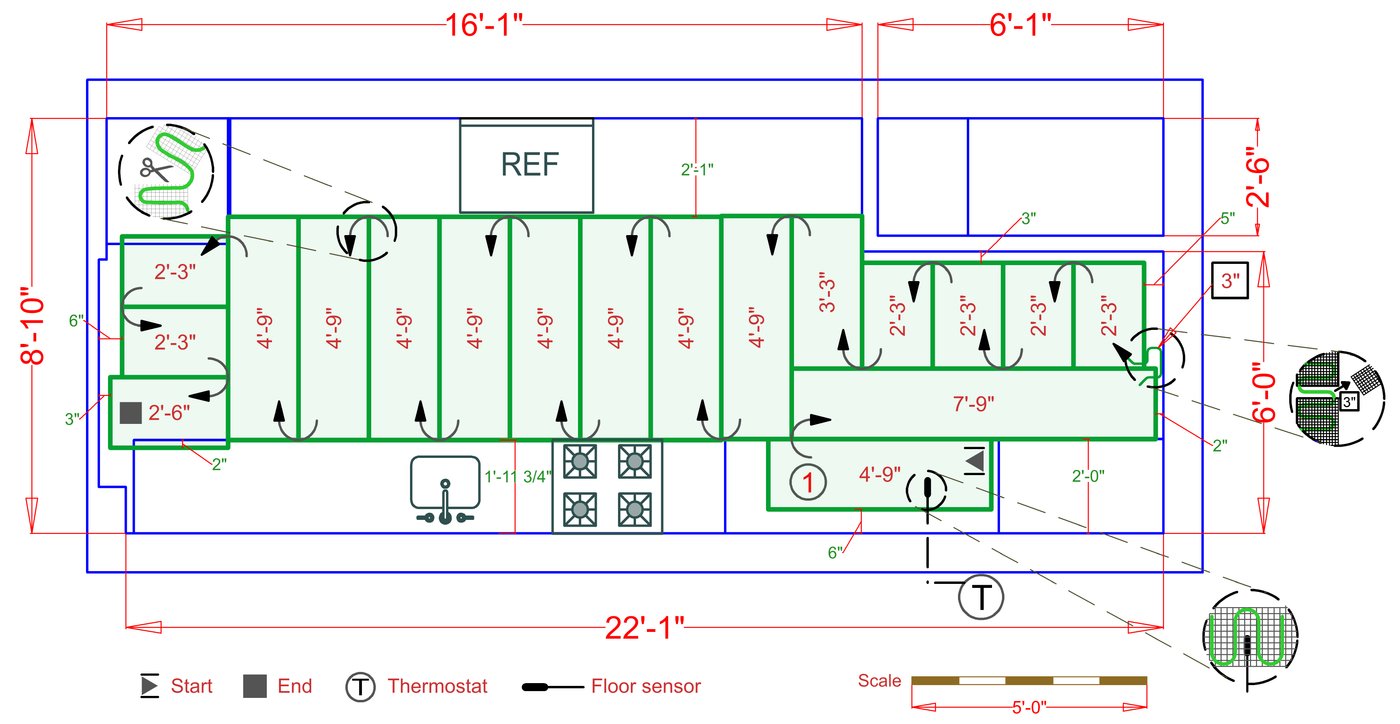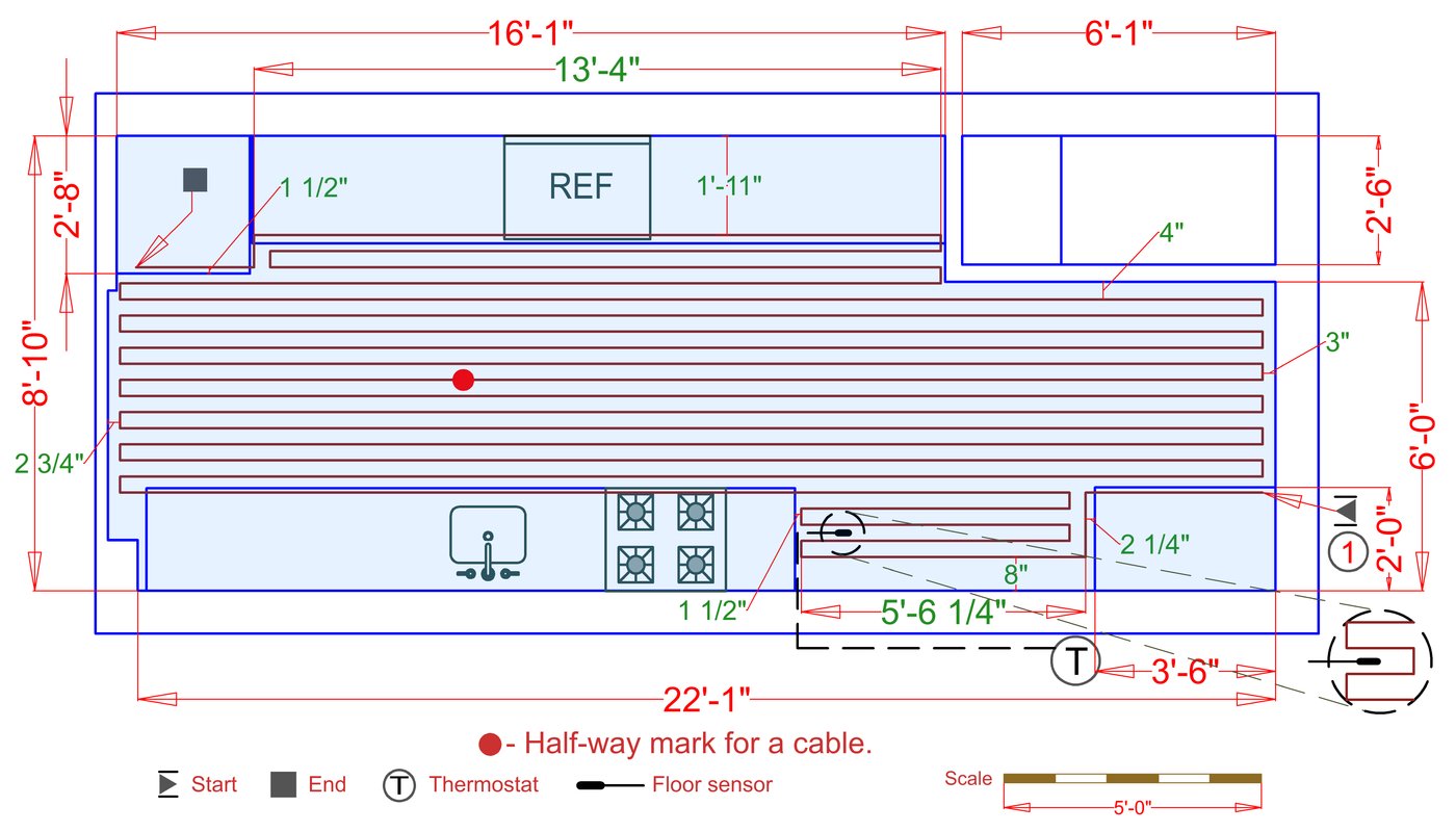 WarmlyYours offers a heating system for all of the most common flooring surfaces, including tile, stone, and marble. Each system type has unique advantages and best applications. Below you will find several different floor plans that are based on this example kitchen. Each breakdown is based on a different heating element and each breakdown will provide product information and costs. If you have any questions about which system type would be best for your project, you can contact usdirectly.Click on any of these available installation options below to see an example floor plan and project breakdown: