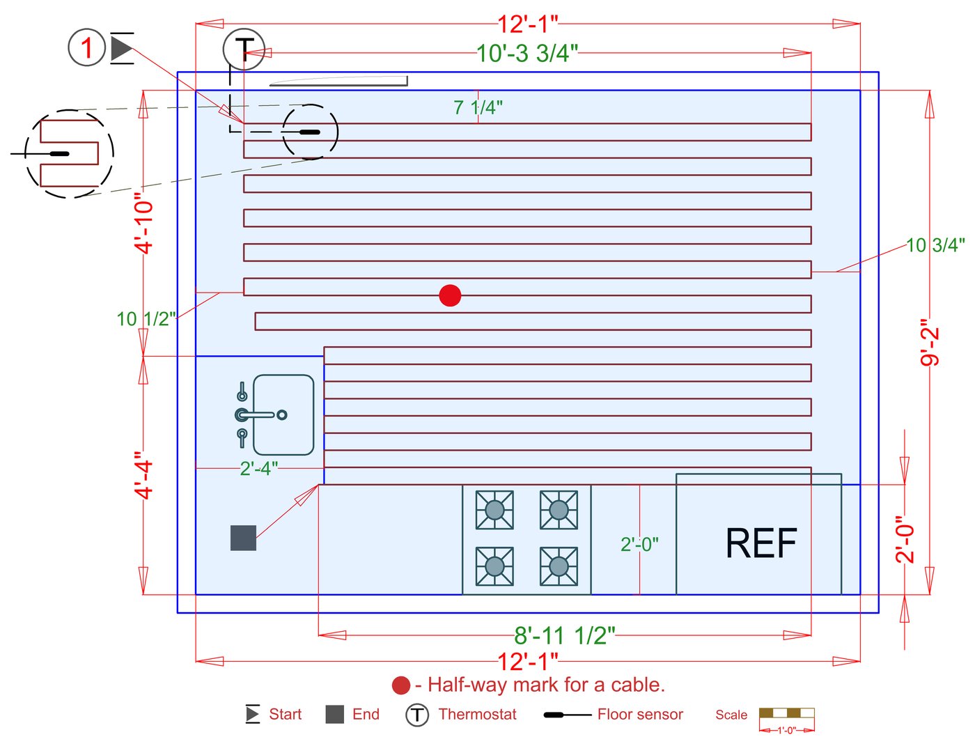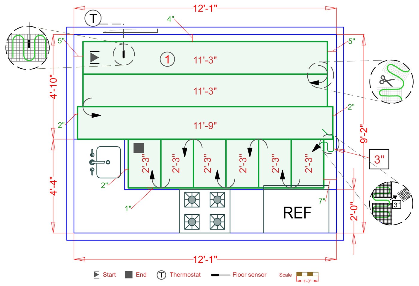 WarmlyYours offers a heating system for all of the most common flooring surfaces, including tile, stone, and marble. Each system type has unique advantages and best applications. Below you will find several different floor plans that are based on this example kitchen. Each breakdown is based on a different heating element and each breakdown will provide product information and costs. If you have any questions about which system type would be best for your project, you can contact usdirectly.Click on any of these available installation options below to see an example floor plan and project breakdown: